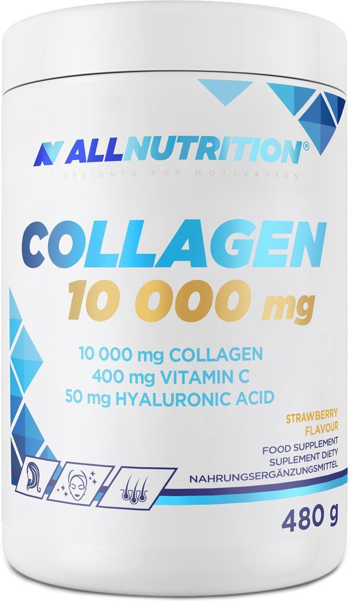 Allnutrition Collagen 10000mg strawberry proszek 480 g Suplement diety ALLNUTRITION COLLAGEN 10 000 to hydrolizowany kolagen w proszku, który stanowi świetne uzupełnienie diety. Produkt ma przemyślany, wspierający skład, dobrą rozpuszczalność i pyszny smak. Wzbogacony o witaminę C i kwas hialuronowy, działa wielotorowo. CO WYRÓŻNIA ALLNUTRITION COLLAGEN 10 000? DOBRZE PRZEMYŚLANY SKŁAD COLLAGEN 10 000 zawiera, aż 10 000 mg kolagenu wołowego, który został poddany procesowi hydrolizy, w celu rozbicia długich łańcuchów kolagenowych na krótsze peptydy czy aminokwasy. Produkt został wzbogacony o witaminę C. W porcji, znajduje się aż 500% jej *referencyjnej wartości spożycia. Oprócz tego, że witamina ta słynie z wsparcia układu odpornościowego, pomaga również w produkcji kolagenu, w celu prawidłowego funkcjonowania skóry, zębów, kości i naczyń krwionośnych [1]. DLA KOGO ALLNUTRITION COLLAGEN 10 000? COLLAGEN 10 000 to produkt o wszechstronnym działaniu. Jest dedykowany wszystkim, którzy pragną dbać o siebie i kondycję fizyczną na wielu płaszczyznach, niezależnie od wieku czy stylu życia. Stosowanie Porcję produktu 12 g (1 miarka) rozpuścić w 200 ml wody, dokładnie wymieszać i spożyć. Nie przekraczać jednej porcji dziennie. Suplement diety. Zawiera substancję słodzącą. Produkt przeznaczony dla osób powyżej 18 roku życia. Nie spożywać w przypadku uczulenia (nadwrażliwości) na którykolwiek składnik produktu. Nie stosować u osób chorujących na kamicę nerkową oraz mających tendencję do tworzenia się kamieni nerkowych. Nie przekraczać zalecanej porcji do spożycia w ciągu dnia. Suplement diety nie może być stosowany jako substytut (zamiennik) zróżnicowanej diety. Zalecany jest zbilansowany sposób żywienia i zdrowy tryb życia. Po użyciu opakowanie należy zawsze zamykać. Produkt może zawierać pochodne: zbóż zawierających gluten, soi, mleka, jaj, nasion sezamu, orzechów i skorupiaków. Najlepiej spożyć przed końcem, nr partii: na spodzie opakowania. Przechowywać w suchym i chłodnym miejscu, w sposób niedostępny dla małych dzieci. Wartość odżywcza: 12 g (1 porcja) Hydrolizat kolagenu wołowego: 10000 mg Witamina C: 400 mg / 500%* Kwas hialuronowy: 50 mg *RWS - referencyjna wartość spożycia Składniki:hydrolizat kolagenu wołowego, maltodekstryna, aromat, regulator kwasowości: kwas cytrynowy, witamina c (kwas l-askorbinowy), barwnik: karoteny, substancja słodząca: sukraloza, kwas hialuronowy (hialuronian sodu) Alergeny:produkt może zawierać pochodne: zbóż zawierających gluten, soi, mleka, jaj, nasion sezamu, orzechów i skorupiaków Masa netto podana na opakowaniu Suplementy diety nie mogą być stosowane jako substytut (zamiennik) zróżnicowanej diety ani zdrowego trybu życia. Nie należy przekraczać zalecanej porcji produktu do spożycia w ciągu dnia. Suplementy diety powinny być przechowywane w sposób niedostępny dla małych dzieci. Przed zastosowaniem produktu sugerujemy zapoznanie się z dokładnymi informacjami podanymi na opakowaniu lub załączonej ulotce. Warunki przechowywania Przechowywać w szczelnym opakowaniu. W suchym i chłodnym miejscu, w sposób niedostępny dla dzieci. Chronić przed światłem Producent SFD Spółka Akcyjna ul. Głogowska 41 45-315 Opole