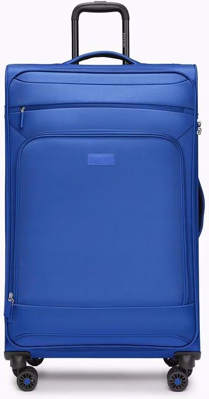 Lekka duża miękka walizka PUCCINI z zamkiem TSA model EM50255A-7 KOS kolor NIEBIESKI Charakterystyka Wymiary zewnętrzne wraz z wystającymi elementami: wysokość: 80 cm szerokość: 50 cm głębokość: 31 cm Waga: 3,40 kg Pojemność: ok 88 l wykonana z POLIESTRU dwupoziomowa teleskopowa rączka górna i boczna rączka do przenoszenia trwały, duraluminiowy stelaż wbudowany w walizkę szyfrowe zamknięcie suwaków zamek TSA 2 zewnętrzne kieszenie - duża i mała cztery obrotowe (360) kółka, które zapewniają stabilność oraz lekkość prowadzenia w dowolnym kierunku wewnątrz pasy przytrzymujące zawartość i duża kieszeń z siateczki