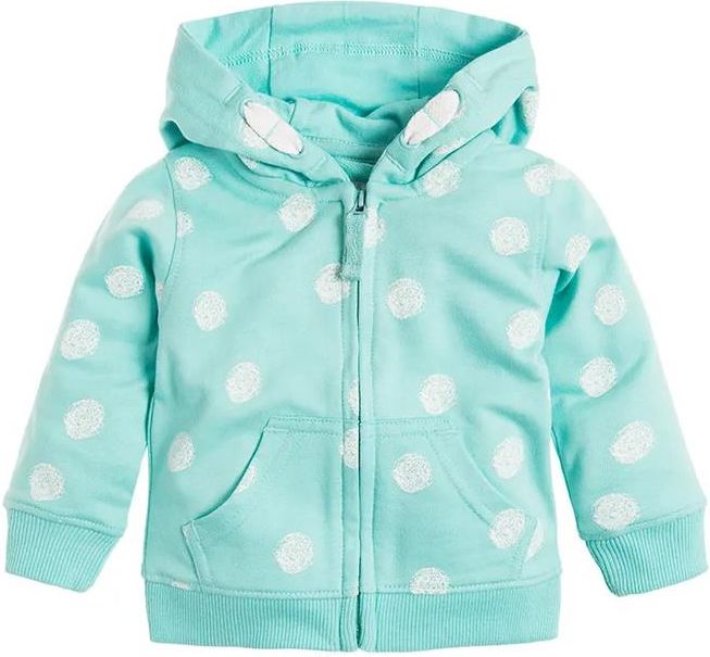 bluza z kapturem dla dziewczynki 60% bawełna, 40% poliester kolor turkusowy wzór w białe grochy zapięcie na suwak zabezpieczenie zamka przy szyi kieszenie kolekcja: Basic pielęgnacja: prać z podobnymi kolorami w temperaturze do 40° C. Prać i prasować po lewej stronie.