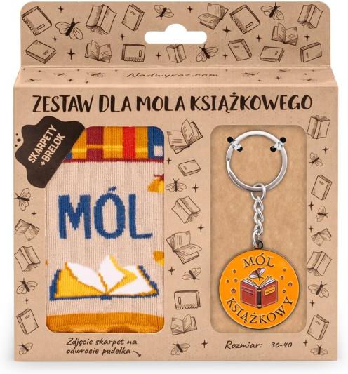 Psotnik kołatek, pustosz kradnik, rybik cukrowy - mól książkowy niejedno ma imię! Jeśli Ty również masz tendencję do żerowania w starych książkach i innych skupieniach wiekowego papieru, niewykluczone, że jesteś jednym z nich! Zestaw DLA MOLA KSIĄŻKOWEGO, w skład którego wchodzą stylowe skarpety i brelok, to idealna propozycja na prezent dla polonisty i miłośnika literatury. Jako dopełnienie upominku polecamy dobrą książkę! Skarpety: Oryginalne skarpety asymetryczne Skład: 80% najwyższej jakości bawełna czesana, 17% poliamid (dodaje wytrzymałości), 3% elastan (skarpetka lepiej dopasowuje się do stopy) Nieuciskający ściągacz i komfortowy płaski szew na palcach Wyprodukowano w Polsce Prać zawsze na lewej stronie w temperaturze maks. 40 C, nie prasować. Brelok z zawieszką do kluczy: Średnica: 4 cm Wykonany z metalu, pokryty emalią Wyprodukowano w Polsce Zestaw: Wymiary pudełka 15,5 cm x 3 cm x 17,5 cm Idealny prezent dla mola książkowego i polonisty