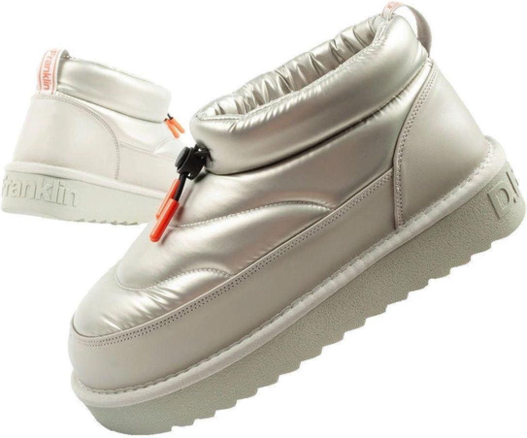 D.Franklin buty śniegowce damskie zimowe modne ocieplane botki srebrne Damskie stylowe buty marki D.Franklin. Podwyższona cholewka wykonana z najwyższej jakości materiałów tekstylnych powlekanych oraz skóry ekologicznej, którą warto przed użyciem zaimpregnować, aby buty posiadały dodatkową ochronę przed wilgocią. Buty ocieplane futerkiem, gwarantują ciepło nawet w bardzo niskich temperaturach. Stoper na górze cholewki zapewnia idealne dopasowanie do stopy. Gruba, w pełni amortyzowana podeszwa zewnętrzna chroniąca przed mrozem. Idealne obuwie do każdej modnej stylizacji. Zimowe śniegowce marki D.Franklin. Buty D.Franklin Nordic to idealne połączenie modnego designu i funkcjonalności. Inspirowane stylem outdoorowym, zapewniają komfort w codziennym użytkowaniu oraz świetnie sprawdzają się w jesienno-zimowych warunkach.