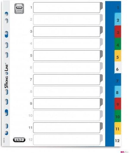 Przekładki polipropylenowe z nadrukowanymi indeksami: - wykonane z mocnego, elastycznego, kolorowego PP - format A4+ - nadruk 1-12 - numeryczne przekładki do segregatora - uniwersalna perforacja umożliwia wpięcie do każdego segregatora - trwałe i odporne na zanieczyszczenie