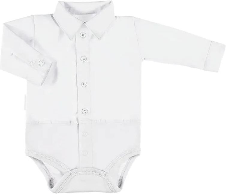 Body chłopięce koszulowe z długim rękawem z kolekcji "Ceremony" uszyte z miękkiej i przyjemnej w dotyku tkaniny. Dół boda wykonany jest z dzianiny. Część tkaninowa jest zapinana na guziczki. Na części dzianinowej znajdują się praktyczne napki. Krój umożliwia całkowite rozpięcie, przez co ubranko jest funkcjonalne i wygodne. Dół boda wykończony jest miękką lamówką. Napki nie zawierają niklu. Wyprodukowane w Polsce, posiada certyfikat "Bezpieczny dla dziecka". Tkanina: 100% bawełna, dzianina: 100% bawełna