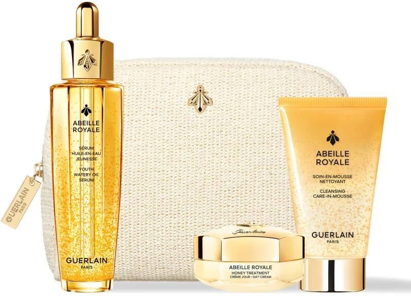 Rytuał Młodości: jędrność, gładkość i redukcja zmarszczek Odkryj moc miodu w pielęgnacji przeciwstarzeniowej Guerlain. Zestaw Abeille Royale łączy trzy wyjątkowe produkty, które działają synergicznie, aby przywrócić skórze młodzieńczy wygląd, jędrność i blask. Zawartość zestawu: • Serum Youth Watery Oil 50ml • Krem na dzień Honey Treatment Day Cream 15ml • Pianka oczyszczająca Cleansing Care-in-Mousse 40ml • Kosmetyczka Moc miodu i mleczka pszczelego Zainspirowane leczniczymi właściwościami miodu, formuły Abeille Royale łączą naukę i naturę, by naprawiać oznaki starzenia się skóry u samych podstaw. W sercu rytuału znajdują się trzy wyjątkowe miody – z wyspy Ouessant (Francja), Wysp Connemara (Irlandia) i lasów Trogstad (Norwegia) – oraz ekskluzywne mleczko pszczele Guerlain. Serum Youth Watery Oil Efekt 15 lat badań, 9 patentów i 9 publikacji. Serum nowej generacji wzmacnia mechanizmy samoregeneracji skóry, zapewniając natychmiastowy efekt wygładzenia i napięcia. Już po 1 kropli skóra staje się bardziej jędrna, nawilżona i promienna. Formuła zawiera 99% składników pochodzenia naturalnego¹. Krem na dzień Honey Treatment Zainspirowany klinicznymi opatrunkami z miodu, ten odżywczy krem w widoczny sposób redukuje zmarszczki i poprawia gęstość skóry. Zawiera 94% składników pochodzenia naturalnego¹, przywraca skórze sprężystość, gładkość i młodzieńczy blask dzień po dniu. Pianka Cleansing Care-in-Mousse Delikatnie oczyszcza i usuwa makijaż, zachowując równowagę skóry. Zawiera regenerujące miody i mleczko pszczele (90% składników naturalnych¹), które chronią barierę hydrolipidową i zapewniają uczucie komfortu nawet w kontakcie z twardą wodą. Udowodniona skuteczność kliniczna Po 1 kropli: głęboka regeneracja i wzmocniona bariera skóry. Po 1 godzinie: skóra jest jędrniejsza, nawilżona (+124%) i wygląda młodziej. Po 1 miesiącu: skóra jest gładsza (+48%), bardziej jędrna (+53%) i elastyczna (+56%). ¹Obliczenia zgodne z normą ISO 16128 (uwzględniające wodę). Sposób użycia Krok 1: Oczyść skórę pianką Cleansing Care-in-Mousse. Krok 2: Nałóż kilka kropli serum Youth Watery Oil, wmasowując je dłońmi od środka twarzy na zewnątrz. Krok 3: Rano uzupełnij rytuał kremem Honey Treatment. #20658 INGREDIENTS :AQUA (WATER) • GLYCERIN • PENTYLENE GLYCOL • POLYGLYCERIN-3 • ALCOHOL • MEL (HONEY) • ROYAL JELLY • POLYGLYCERYL-10 STEARATE • MANNITOL • POLYGLYCERYL-10 OLEATE • MICROCRYSTALLINE CELLULOSE • CHLORPHENESIN • PARFUM (FRAGRANCE) • PROPANEDIOL • POLYACRYLATE CROSSPOLYMER-6 • TRISODIUM ETHYLENEDIAMINE DISUCCINATE • HYDROXYACETOPHENONE • CITRIC ACID • SODIUM CITRATE • BIOSACCHARIDE GUM-2 • TOCOPHERYL ACETATE • MALTODEXTRIN • ADENOSINE • CAPRYLIC/CAPRIC TRIGLYCERIDE • SYNTHETIC FLUORPHLOGOPITE • ACRYLATES/AMMONIUM METHACRYLATE COPOLYMER • TRIETHYL CITRATE • CI 77891 (TITANIUM DIOXIDE) • SODIUM BENZOATE • BIOSACCHARIDE GUM-1 • POTASSIUM SORBATE • CI 77492 (IRON OXIDES) • HYDROXYPROPYL METHYLCELLULOSE • CI 77491 (IRON OXIDES) • HELIANTHUS ANNUUS (SUNFLOWER) SEED OIL • PROPOLIS EXTRACT • SIMETHICONE • TIN OXIDE. #18038 INGREDIENTS :AQUA (WATER) • GLYCERIN • C15-19 ALKANE • SQUALANE • PROPANEDIOL • JOJOBA ESTERS • GLYCERYL STEARATE • PEG-100 STEARATE • POLYGLYCERIN-3 • C12-15 ALKYL BENZOATE • CELLULOSE • COCO-CAPRYLATE/CAPRATE • ROYAL JELLY • CAPRYLYL GLYCOL • CETYL ALCOHOL • STEARYL ALCOHOL • STEARETH-21 • AMMONIUM ACRYLOYLDIMETHYLTAURATE/VP COPOLYMER • PARFUM (FRAGRANCE) • TRIBEHENIN • BUTYROSPERMUM PARKII (SHEA) BUTTER • DIMETHICONE • PHYTOSTERYL/OCTYLDODECYL LAUROYL GLUTAMATE • CHLORPHENESIN • MEL (HONEY) • ACRYLATES/C10-30 ALKYL ACRYLATE CROSSPOLYMER • TOCOPHERYL ACETATE • SODIUM HYALURONATE • XANTHAN GUM • CERAMIDE NG • PEG-10 PHYTOSTEROL • HYDROGENATED OLIVE OIL UNSAPONIFIABLES • SODIUM HYDROXIDE • LACTIC ACID • CI 77492 (IRON OXIDES) • TOCOPHEROL • PALMITOYL HEXAPEPTIDE-12 • GLYCINE SOJA (SOYBEAN) OIL • SILICA. #20781 INGREDIENTS :AQUA (WATER) • ACRYLATES COPOLYMER • COCAMIDOPROPYL BETAINE • LAURYL GLUCOSIDE • GLYCERIN • PENTYLENE GLYCOL • DISODIUM COCOYL GLUTAMATE • MEL (HONEY) • MEL EXTRACT (HONEY EXTRACT) • ROYAL JELLY • PARFUM (FRAGRANCE) • SODIUM COCOYL GLUTAMATE • SODIUM HYDROXIDE • PROPANEDIOL • CAPRYLYL GLYCOL • SODIUM BENZOATE • HYDROXYACETOPHENONE • MANNITOL • HYDROLYZED JOJOBA ESTERS • MICROCRYSTALLINE CELLULOSE • CITRIC ACID • SODIUM METABISULFITE • PHENETHYL ALCOHOL • CAPRYLIC/CAPRIC TRIGLYCERIDE • SODIUM CARRAGEENAN • CI 77492 (IRON OXIDES) • MARIS SAL (SEA SALT) • HYDROXYPROPYL METHYLCELLULOSE. LVMH Group 3 Avenue George V 75008 Paris Francja +33 (0)1 44 13 22 22 Tylko do użytku zewnętrznego. Unikać kontaktu z oczami.