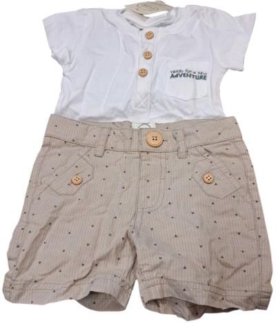 Body na krótki rękaw – wykonane z miękkiej, oddychającej bawełny, zapewniającej komfort noszenia. Zapinane na praktyczne ułatwienie przebierania. Spodenki – lekkie i elastyczne, zapewniające swobodę użytkowania. Posiadają wygodną gumkę w pasie, dzięki czemu doskonale dopasowują się do sylwetki maluszka. Cechy produktu: Wysokiej jakości materiał – 100% bawełna Przyjazne dla skóry dziecka Łatwe do wytwarzania i usuwania Modny, chłopięcy design