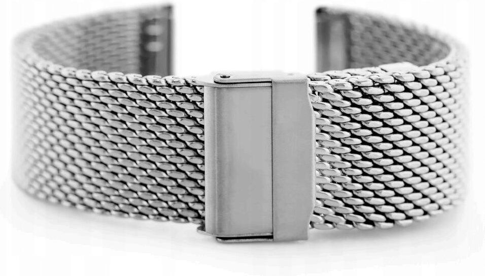WYMIARY szerokość przy mocowaniu: 24mm szerokość bransolety: 24mm długość całkowita po rozłożeniu: 205 mm maksymalny obwód: ok. 17 cm (do obwodu należy doliczyć rozmiary koperty docelowego zegarka) OPIS Stalowa bransoletka do zegarka typu 'siatka' wysokiej jakości w kolorze srebrnym Regulowane zapięcie - zakres regulacji ok. 5cm