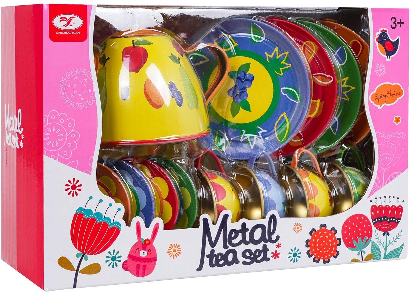 Opis Owocowy Zestaw do Herbaty Metalowy, owocowy zestaw do herbaty dla dzieci powyżej trzeciego roku życia. Zestaw składa się z 15 elementów i zawiera wszystko, co niezbędne by Twoja pociecha mogła zaserwować herbatkę. W zestawie znaleźć możemy czajniczek, filiżanki, spodki, talerzyki czy tacę. Elementy zestawu wykonano z metalu i pokryto bezpieczną, nietoksyczną farbą w żywych kolorach. Funkcje: zestaw dla dzieci od trzeciego roku życia, zawiera wszystko, co niezbędne do serwowania herbaty, bogactwo kolorów przyciąga wzrok dziecka, idealny zestaw prezentowy: Wymiary czajnik ok. 12 cm x 7,9 cm, taca ok. 24,1 cm x 15,7 cm, spodek pod filiżankę ok. 5,8 cm x 5,8 cm, filiżanka ok. 6,3 cm x 2,8 cm, talerzyk ok. 9 cm x 9 cm, opakowanie ok. 24,5 cm x 16,5 cm x 9 cm. Zawartość zestawu czajnik, taca, 4 x spodek pod filiżankę, 4 x filiżanka, 4 talerzyki.