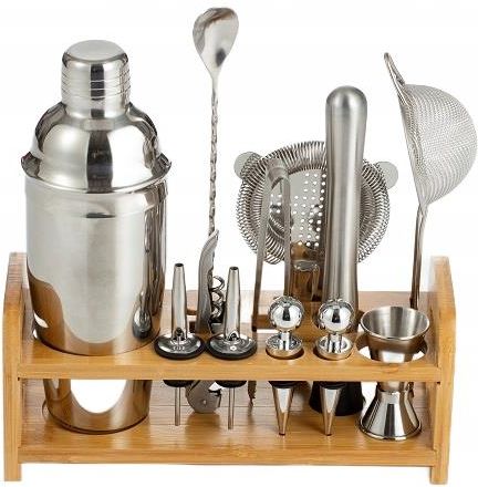 Zestaw barmański 12 elementowy z prostokątną podstawką srebrny Zestaw barmański 12 elementowy z prostokątną podstawką srebrny Zestaw barmański jest idealnym rozwiązaniem do zastosowania w każdym nowoczesnym domu. Twoi goście będą zaskoczeni oryginalnym sposobem przygotowywania drinków. Podstawka ułatwia organizację i przechowywanie akcesoriów po zakończeniu miksowania. Zestaw składa się z następujących elementów 1 x shaker cobbler (trzy-częściowy z sitkiem) 750 ml 1 x szczypce do lodu 2 x nalewak 1 x dwustronna miarka 15 ml/30 ml - "jigger" z oznaczeniem pojemności na wewnętrznej ściance 1 x filtr z płaską rączką "strainer" 1 x korkociąg 1 x sitko o drobnych ockach 1 x łyżka barmańska z podstawką 2 x zatyczki do butelek 1 x bambusowa podstawka Kolor akcesoriów: srebrny połysk Zestaw barmański 12 elementowy z prostokątną podstawką srebrny Zestaw barmański jest idealnym rozwiązaniem do zastosowania w każdym nowoczesnym domu. Twoi goście będą zaskoczeni oryginalnym sposobem przygotowywania drinków. Podstawka ułatwia organizację i przechowywanie akcesoriów po zakończeniu miksowania. Zestaw składa się z następujących elementów 1 x shaker cobbler (trzy-częściowy z sitkiem) 750 ml 1 x szczypce do lodu 2 x nalewak 1 x dwustronna miarka 15 ml/30 ml - "jigger" z oznaczeniem pojemności na wewnętrznej ściance 1 x filtr z płaską rączką "strainer" 1 x korkociąg 1 x sitko o drobnych ockach 1 x łyżka barmańska z podstawką 2 x zatyczki do butelek 1 x bambusowa podstawka Kolor akcesoriów: srebrny połysk