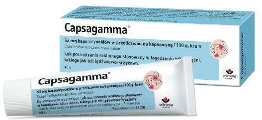 Lek Capsagamma jest lekiem roślinnym stosowanym u pacjentów dorosłych w łagodzeniu bólu mięśni, takiego jak ból lędźwiowo-krzyżowy. Przeciwwskazania Kiedy nie stosować leku Capsagamma w przypadku alergii na substancję czynną lub inne kapsaicynoidy (np. papryka, chili) lub którąkolwiek z substancji pomocniczych wymienionych w punkcie 6; nie należy stosować na uszkodzoną skórę (otarcia skóry, rany, wysypka) oraz na błony śluzowe i w okolicy oczu. Ostrzeżenia Przed zastosowaniem kremu Capsagamma należy skonsultować się z lekarzem lub farmaceutą. Nie należy stosować tego produktu leczniczego w pobliżu oczu lub błon śluzowych. Nie należy drapać miejsca, w którym zastosowano krem, aby uniknąć uszkodzenia skóry. Podczas leczenia należy unikać ekspozycji na źródła ciepła (promieniowanie słoneczne lub podczerwone, ciepłe okłady lub ciepła woda). Uczucie pieczenia może nasilać się również podczas nadmiernego wysiłku fizycznego (pocenie się). Leczenie należy przerwać jeśli uczucie pieczenia odczuwane jest jako nadmierne. W takim przypadku należy usunąć ze skóry pozostałości kremu. Jeśli objawy ulegają pogorszeniu podczas stosowania tego produktu leczniczego, należy skonsultować się z lekarzem lub farmaceutą. Nie zaleca się stosowania kremu u pacjentów leżących (ze względu na zwiększenie ryzyka odleżyn). Dzieci i młodzież - Nie należy stosować kremu Capsagamma u dzieci i młodzieży w wieku poniżej 18 lat z uwagi na brak danych dotyczących bezpieczeństwa i skuteczności w tej grupie wiekowej. Lek Capsagamma a inne leki - Należy powiedzieć lekarzowi lub farmaceucie o wszystkich lekach stosowanych obecnie lub ostatnio, a także o lekach, które pacjent planuje stosować. Nie zaleca się jednoczesnego stosowania produktu Capsagamma w tym samym miejscu z innymi produktami stosowanymi miejscowo [np. żele rozgrzewające (zwiększające ukrwienie i powodujące zaczerwienienie skóry) lub żele przeciwbólowe]. Interakcje z innymi produktami leczniczymi stosowanymi w tym samym miejscu na skórze mogą zachodzić nawet do 12 godzin po aplikacji. Ciąża, karmienie piersią i wpływ na płodność - Jeśli pacjentka jest w ciąży lub karmi piersią, przypuszcza że może być w ciąży lub gdy planuje mieć dziecko, powinna poradzić się lekarza przed zastosowaniem tego leku. Brak danych dotyczących stosowania u kobiet w ciąży. Kapsaicyna przenika barierę łożyska i może przenikać do mleka kobiecego. Nie zaleca się samodzielnego stosowania leku przez pacjentki. Prowadzenie pojazdów i obsługiwanie maszyn - Lek Capsagamma nie ma wpływu na zdolność do prowadzenia pojazdów i obsługiwania maszyn. Sposób użycia Jeśli nie zalecono inaczej, u dorosłych i osób w podeszłym wieku należy stosować 2-4 razy na dobę cienką warstwę na skórę w bolącym miejscu. Należy pozwolić na wchłonięcie się kremu. Po zastosowaniu lub dotknięciu kremu należy dokładnie umyć ręce wodą i mydłem. Jeśli objawy utrzymują się podczas stosowania produktu leczniczego, należy skonsultować się z lekarzem lub farmaceutą. Leczenie należy kontynuować aż do uzyskania złagodzenia bólu, jeśli to niezbędne, do 3 tygodni. Po 3 tygodniach stosowania należy zrobić co najmniej 2 tygodniową przerwę w stosowaniu. Przechowywanie Lek należy przechowywać w miejscu niewidocznym i niedostępnym dla dzieci. Nie stosować tego leku po upływie terminu ważności zamieszczonego na pudełku i tubie po: EXP. Termin ważności oznacza ostatni dzień podanego miesiąca. Składniki Substancją czynną leku jest standaryzowany wyciąg gęsty z owoców pieprzowca (Capsici extractum spissum normatum) 100 g kremu zawiera: 2,375 – 1,032 mg standaryzowanego wyciągu gęstego z Capsicum annuum L. var. minimum (Miller) Heiser i Capsicum frutescens L, fructus (owoc pieprzowca) (DERpierwotny 2,8-4,9:1), co odpowiada 53 mg kapsaicynoidów, w przeliczeniu na kapsaicynę. Rozpuszczalnik ekstrakcyjny: etanol 80% (V/V). Pozostałe składniki leku to: Sorbitanu stearynian, makrogolu stearynian, glicerol 85%, triglicerydy kwasów tłuszczowych o średniej długości łańcucha, tytanu dwutlenek, fenoksyetanol, karbomer 980, olejek eteryczny rozmarynowy, sodu wodorotlenek, woda oczyszczona, glukoza ciekła
