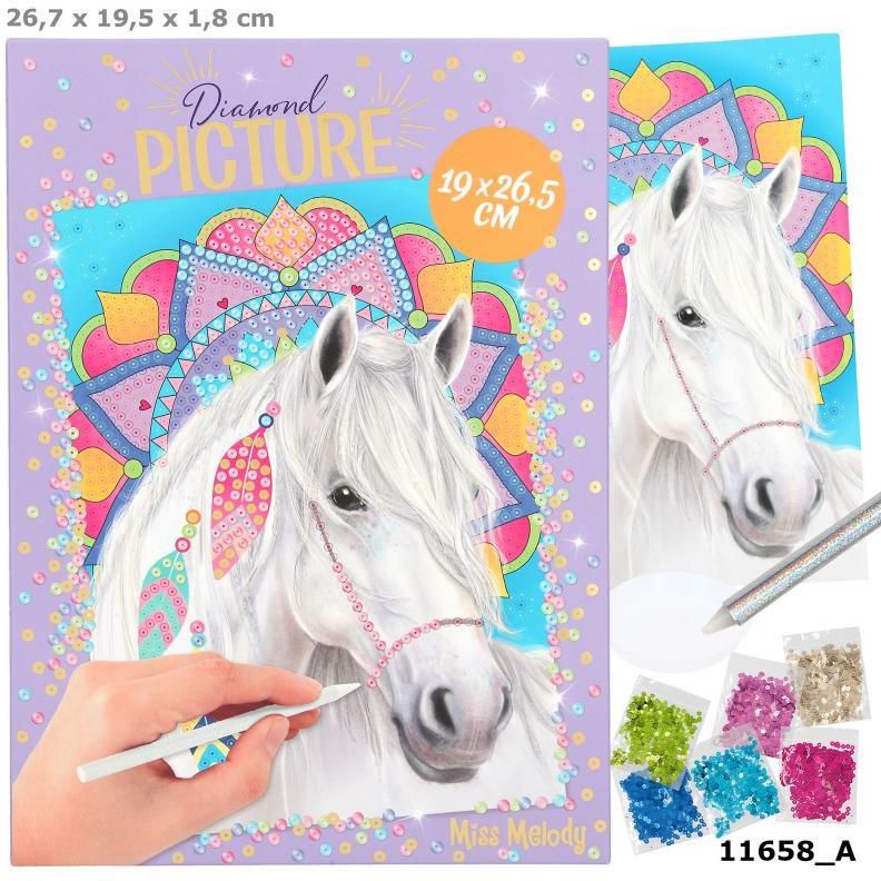 Fantastycznie lśniąca piękność: Dzięki „Create your Diamond” od Miss Melody możesz łatwo stworzyć niesamowity obraz. Z 6 różnymi cekinami, które są dostarczane za pomocą dołączonego "kija" na szablonie obrazu. Plus: mała miseczka do sortowania cekinów. Rozmiar zdjęcia konia: 19 x 26,5 cm. wiek: +6