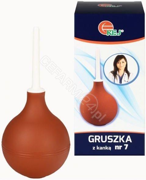 KEJ Gruszka zkońcówką nr 7 to wyrób medyczny przeznaczony do wykonywania lewatywydoodbytniczej u dzieci oraz dorosłych. Produkt stosowany jest w celu łagodzeniazaparć i dolegliwości takich jak kolki brzuszne, a także do przygotowania jelitprzed zabiegami chirurgicznymi w obrębie jamy brzusznej.