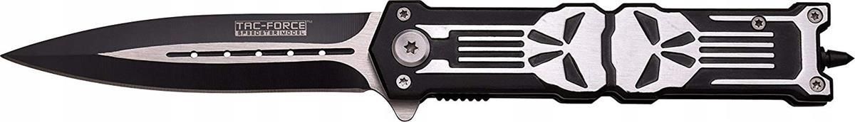 Długość ostrza: 9, 5 cm i grubość ostrza 3 mm, nierdzewne 2 kolorowe ostrze Spear Point Ok. 12 cm długości w stanie zamkniętym Wzór trupiej czaszki na czarnym aluminiowym uchwycie Tac Force