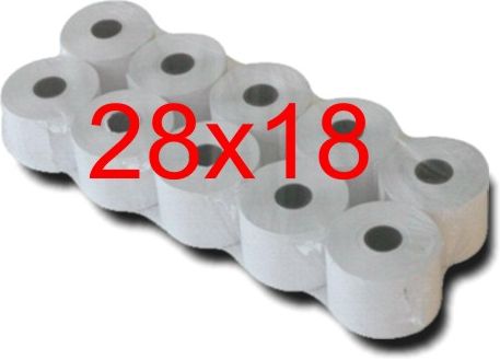 Rolki termiczne do kasy fiskalnej 28x18 Cena dotczy 1 zgrzewki (10 szt rolek) Pasują między innymi do kas: Datecs Maluch Bis Datecs MP54 Datecs MP55 Datecs MP55N Datecs MP56 Datecs MP54N Rolkę 28x18 można założyć do kas, w których pasuje rolka 28x30