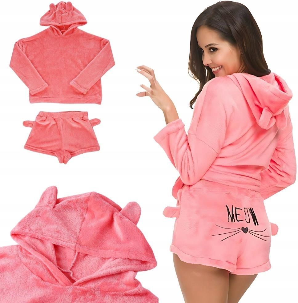 CIEPŁA PIŻAMA DAMSKA DWUCZĘŚCIOWA Z KAPTUREM MIĘKKA PLUSZOWA KRÓTKIE L Góra Kalwaria