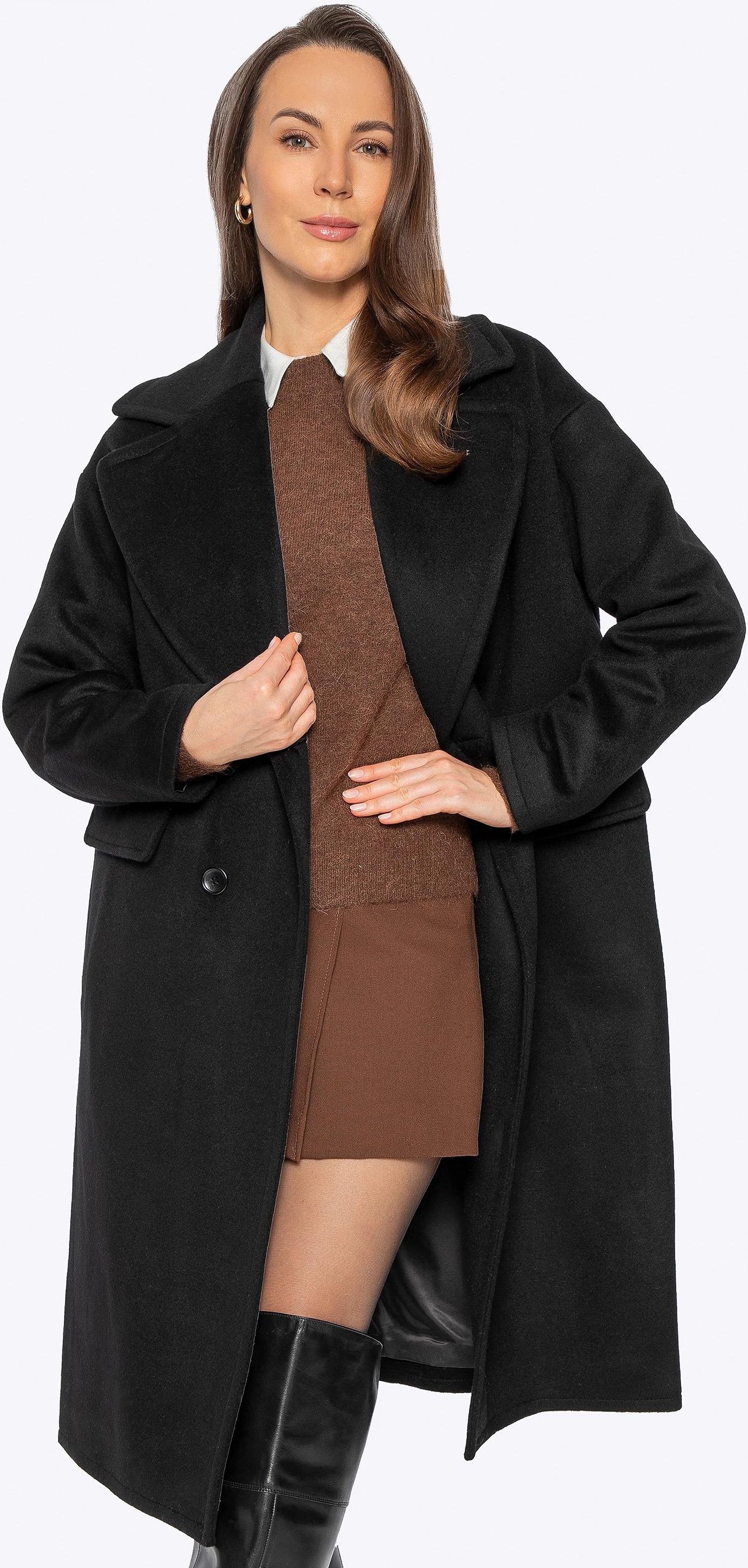 Damski płaszcz dwurzędowy z wełny i domieszką kaszmiru czarny Góra Kalwaria