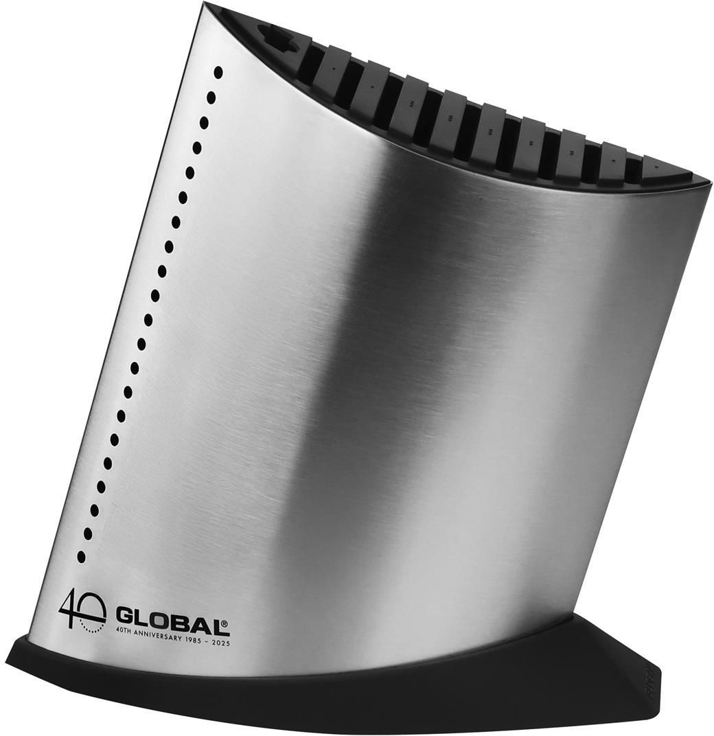 Global z okazji 40-lecia marki wypuścił wyjątkowy blok na noże w edycji Limited 40th Anniversary. Ten ekskluzywny produkt łączy w sobie ikoniczny design z nowoczesnymi rozwiązaniami, podkreślając wieloletnie doświadczenie marki w tworzeniu najwyższej jakości narzędzi kuchennych. Limitowana edycja to doskonały wybór dla kolekcjonerów i miłośników sztuki kulinarnej, ceniących unikalny styl i funkcjonalność. Średniej wielkości blok z dziesięcioma otworami na 9 noży o różnej szerokości (nie dłuższych niż 24cm) oraz specjalnym otworem na parę nożyczek kuchennych lub pręt ostrzący. Urzekający projekt autorstwa Komina Yamady przypomina kształt żaglowca pod pełnymi żaglami. Srebrny kadłub ozdobiono czarnymi kropkami i wyposażono w czarną, przeciwpoślizgową podstawę, którą można zdjąć. Dzięki takiemu rozwiązaniu znika problem czyszczenia otworów, co ułatwia przestrzeganie nawet najwyższych standardów higieny. Ten piękny, funkcjonalny blok pozwoli bezpiecznie przechowywać cenne noże i utrzymywać je w nieskazitelnym stanie. Dane techniczne Wysokość: 27 cm Szerokość: 25,4 cm Głębokość: 9,8 cm Waga: 1182 g
