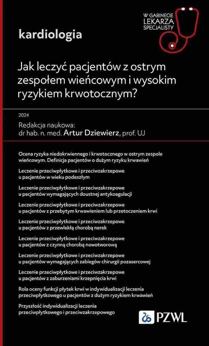 Kompendium wiedzy na temat leczenia pacjentów z ostrym zespołem wieńcowym i wysokim ryzykiem krwotocznym. Obejmuje ono stratyfikację ryzyka, omówienie odrębności postępowania w szczególnych grupach pacjentów oraz określenie roli zaawansowanej diagnostyki laboratoryjnej. Do współpracy przy jego tworzeniu zaprosiliśmy nie tylko naukowców, ale przede wszystkim praktyków o ogromnym doświadczeniu klinicznym. Dzięki temu treść poszczególnych rozdziałów ma wysoki walor praktyczny i może być bezpośrednio wykorzystana w codziennej pracy. Ostatni z rozdziałów nieco odbiega od tej koncepcji i poświęcony jest nowym możliwościom diagnostyki i terapii tej grupy chorych, przedstawiając innowacyjne rozwiązania, które mogą znaleźć zastosowanie w najbliższej przyszłości. Mamy nadzieję, że niniejsze opracowanie stanie się cennym narzędziem w rękach specjalistów, przyczyniając się do poprawy opieki nad pacjentami z ostrym zespołem wieńcowym i wysokim ryzykiem krwawień. Jak leczyć pacjentów z ostrym zespołem wieńcowym i wysokim ryzykiem krwotocznym? W gabinecie lekarza Ta publikacja stanowi nieocenione źródło wiedzy dla lekarzy i specjalistów zajmujących się kardiologią. Skupia się na wyzwaniach związanych z leczeniem pacjentów z ostrym zespołem wieńcowym, którzy znajdują się w grupie wysokiego ryzyka krwotocznego. Książka dostarcza praktycznych wskazówek oraz aktualnych informacji na temat diagnostyki i terapii, co czyni ją niezbędnym narzędziem w codziennej praktyce medycznej. Dla kogo jest ta książka? Specjaliści kardiolodzy Interniści i lekarze pierwszego kontaktu Studenci medycyny i młodsze kadry medyczne Osoby zainteresowane nowoczesnymi metodami leczenia chorób serca Co zyskasz dzięki tej publikacji? Praktyczne wskazówki: Dowiedz się, jak skutecznie diagnozować i leczyć pacjentów z ostrym zespołem wieńcowym. Aktualna wiedza: Zapoznaj się z najnowszymi badaniami i wytycznymi w zakresie terapii. Bezpieczeństwo pacjentów: Zrozumienie ryzyka krwotocznego i jak je minimalizować w praktyce klinicznej. Wsparcie w codziennej praktyce: Książka dostarcza narzędzi, które ułatwiają podejmowanie decyzji klinicznych. Kluczowe tematy i obszary Ostry zespół wieńcowy Ryzyko krwotoczne w terapii Diagnostyka i leczenie chorób serca Nowoczesne metody terapeutyczne Praktyczne podejście do pacjenta O Autorze Artur Dziewierz – doświadczony specjalista w dziedzinie kardiologii, autor wielu publikacji naukowych oraz praktycznych poradników dla lekarzy. Jego wiedza i doświadczenie w zakresie leczenia chorób serca są nieocenione dla każdego, kto pragnie poszerzyć swoje umiejętności w tej dziedzinie. O Wydawcy PZWL – renomowane wydawnictwo specjalizujące się w publikacjach medycznych, które dostarcza wysokiej jakości materiały edukacyjne dla profesjonalistów w dziedzinie medycyny. Producent/osoba odpowiedzialna za bezpieczeństwo produktuPZWL Wydawnictwo Lekarskie Sp. z o.o.ul. G. Daimlera 202-460 Warszawarecepcja@pwn.pl22 695 48 15