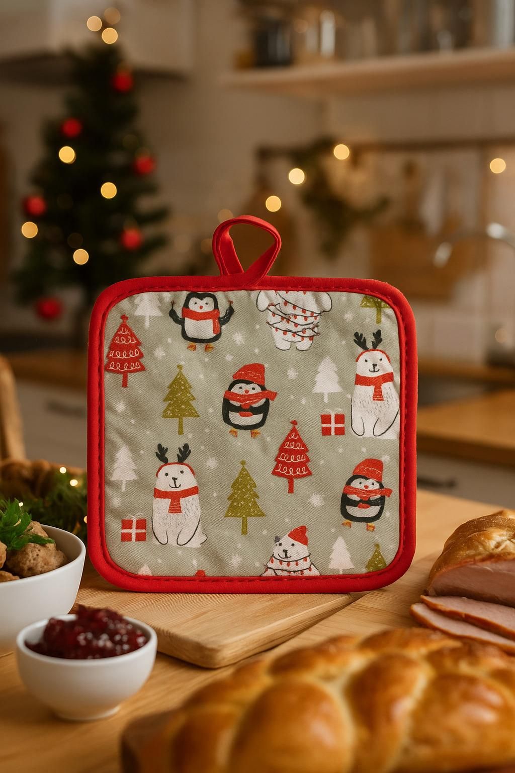 Świąteczna podkładka pod garnek wykonana została z bawełny i wypełniona poliestrową pianką. Posiada efektowny nadruk, który urozmaici niejedno wnętrze.
