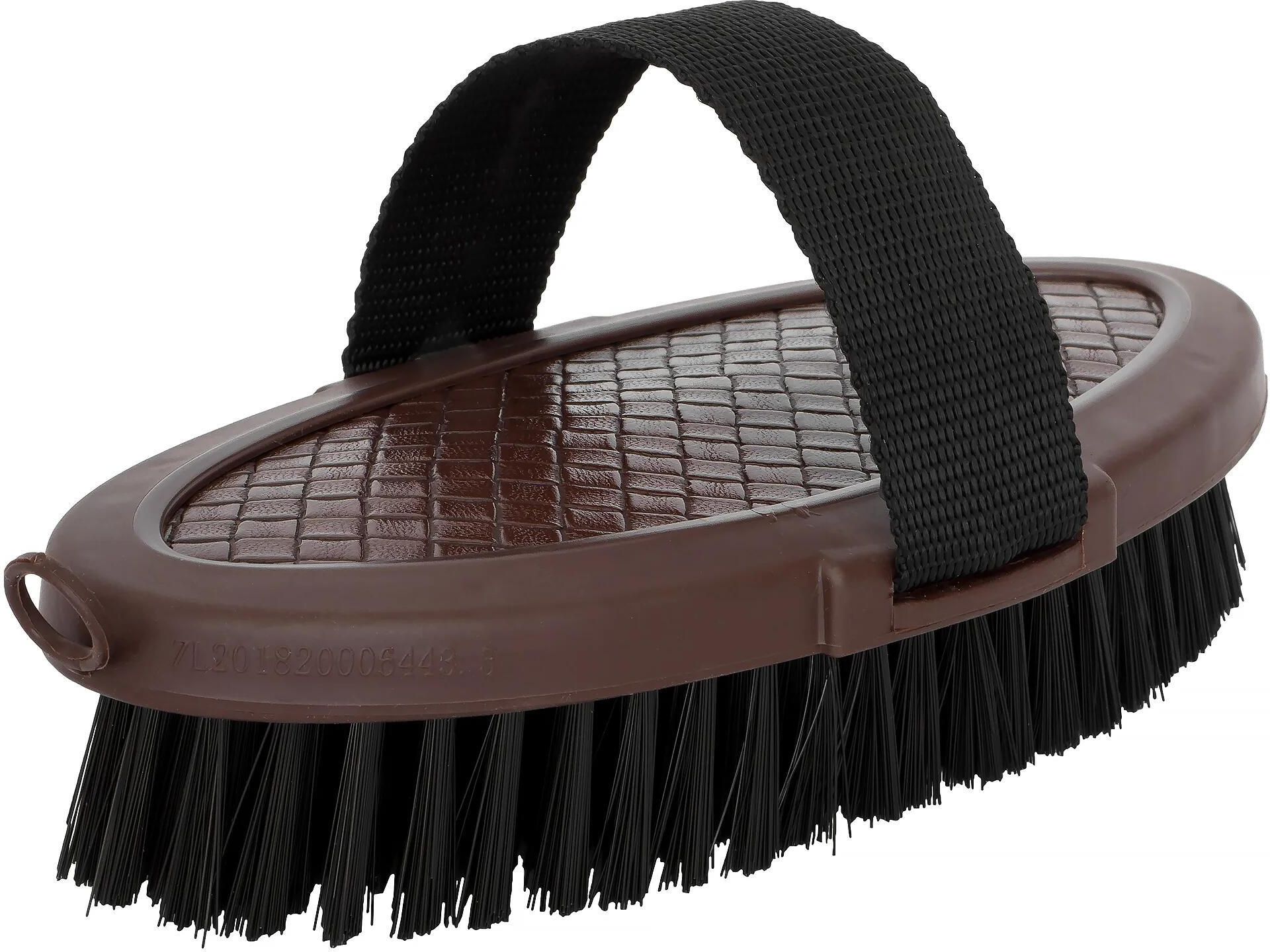 Szczotka dla konia START Braided z paskiem do usuwania kurzu brązowa Szczotka START Braided z paskiem to doskonałe narzędzie do pielęgnacji sierści konia, które łączy funkcjonalność z wygodą użytkowania. Wykonana z trwałego plastiku i wyposażona w gęste, elastyczne włosie, szczotka skutecznie usuwa brud, kurz oraz luźną sierść, zapewniając koniowi czystość i komfort. Charakterystyczny pleciony wzór na rękojeści, w połączeniu z praktycznym paskiem na rękę, zapewnia pewny i stabilny chwyt podczas użytkowania, co jest kluczowe dla efektywnego czyszczenia. Pasek poprawia kontrolę i zmniejsza ryzyko przypadkowego upuszczenia szczotki, co jest szczególnie przydatne podczas intensywnych sesji pielęgnacyjnych. Kompaktowe wymiary i ergonomiczny kształt szczotki umożliwiają łatwe manewrowanie i dotarcie do trudno dostępnych miejsc na ciele konia. Szczotka START Braided z paskiem to niezbędny element wyposażenia każdego właściciela konia, dbającego o idealny wygląd i zdrowie swojego zwierzęcia.