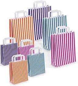 Ciekawy wygląd: barwne kolory pasków przykuwające uwagę. Odporna na zerwanie. Pojemna: wyposażona w zakładki boczne, pozwalające umieścić wewnątrz kilka przedmiotów. Wykonana z gładkiego papieru kraft. Posiada płaskie uchwyty. Dostępna w 4 kolorach. Jednostka sprzedaży: paczka. Ilość w paczce: 50 szt.