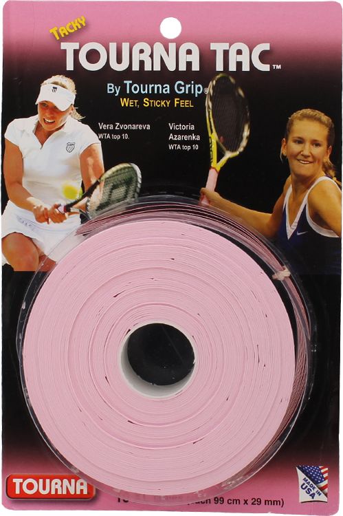 Owijki wierzchnie Tourna Tac XL różowe x10 Owijki wierzchnie marki Tourna popularne wśród zawodowców. Zaaplikowane materiały powodują, że owijka jest wyjątkowo lepka, a jednocześnie przyjemnie miękka. Na Tournę Tacy XL zdecydowała się sama światowa czołówka np. J. Tipsarevic, T. Robredo, G. Simon. W opakowaniu znajduje się 10 owijek i tasiemki mocujące.