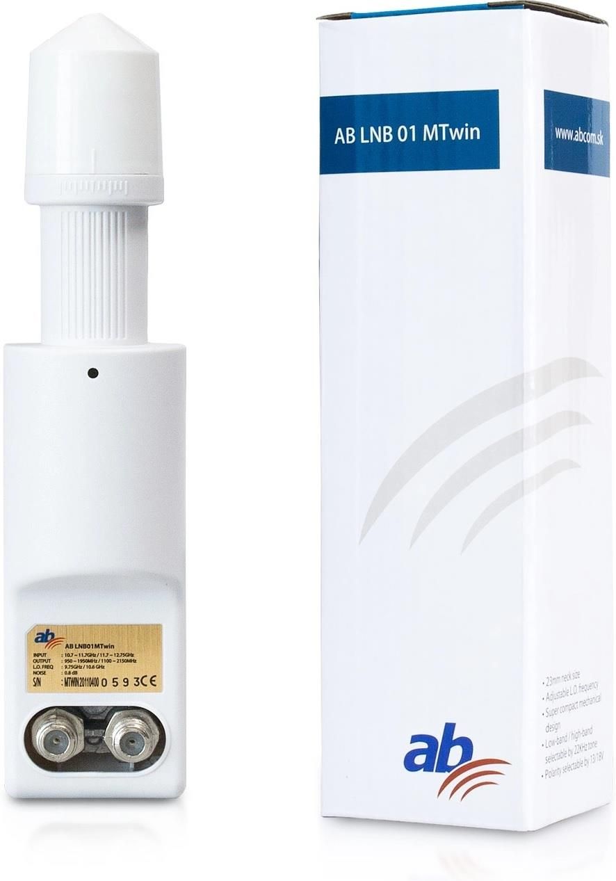 Konwerter twin Konwerter do odbioru sygnału satelitarnego, wersja multifeed, cienka szyjka 23mm (w komplecie adapter na 40mm). Zysk 60dB, zintegrowany filtr LTE. Konerter satelitarny LNB Twin AB LNB01 MTwin Multifeed Dane techniczne: możliwość montażu LNB co 2 ultra cienki - srednica całego LNB (Ø30mm) mocowanie standardowe Ø23mm / w komplecie adapter mocujący na 40mm solidna obudowa Technologia Slim Feed długa żywotność zalecany do DVB-S2 (HDTV) 4K wsp. szumów 0,1 dB mały pobór prądu