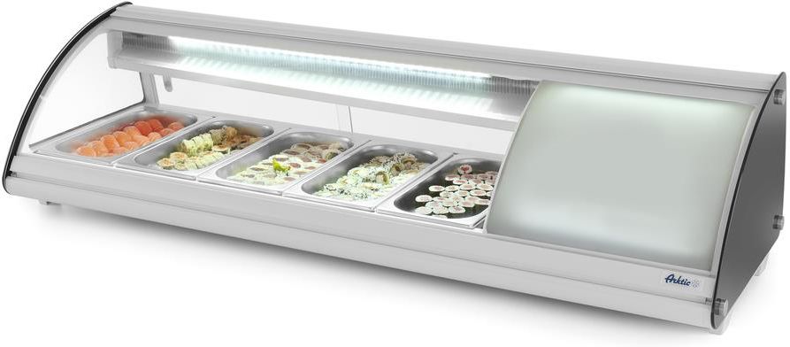 Witryna chłodnicza do sushi nr kat. 233757, Arktic. Cechy produktu: Do użytku w profesjonalnej gastronomii. Konstrukcja ze stali nierdzewnej malowanej na biało. Podwójna, gięta, bezpieczna szyba frontowa. Dostęp do komory przez tylne, 2-częściowe drzwi przesuwne lub przednią uchylną szybę. …