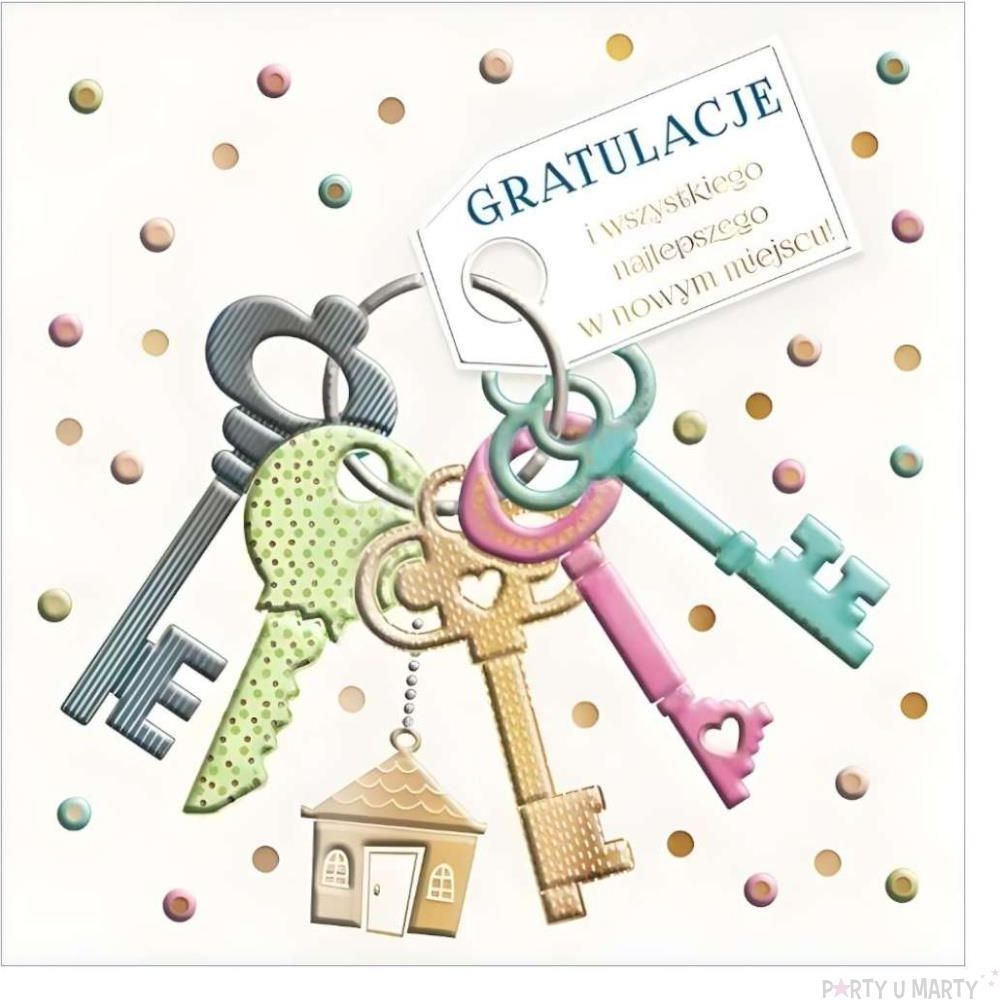 Wybierasz się na domówkę z okazji przeprowadzki? A może zamierzasz złożyć komuś życzenia w formie listu? Śliczna kartka okolicznościowa zdecydowanie Ci się przyda! Na białej kartce widać pęk kluczy z brelokiem, na którym widnieje napis "GRATULACJE I WSZYSTKIEGO NAJLEPSZEGO W NOWYM MIEJSCU" oraz …