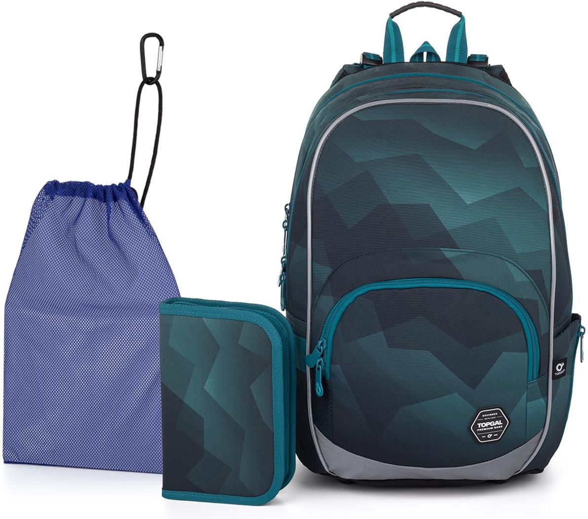 Zestaw szkolny składający się z plecaka, piórnika i worka. Komplet szkolny składa się z produktów: KIMI 25020 - Plecak szkolny w zielone zygzaki, PENN 25020 - Piórnik szkolny z dwoma skrzydłami, ZUZA 19046 - Worek na obuwie