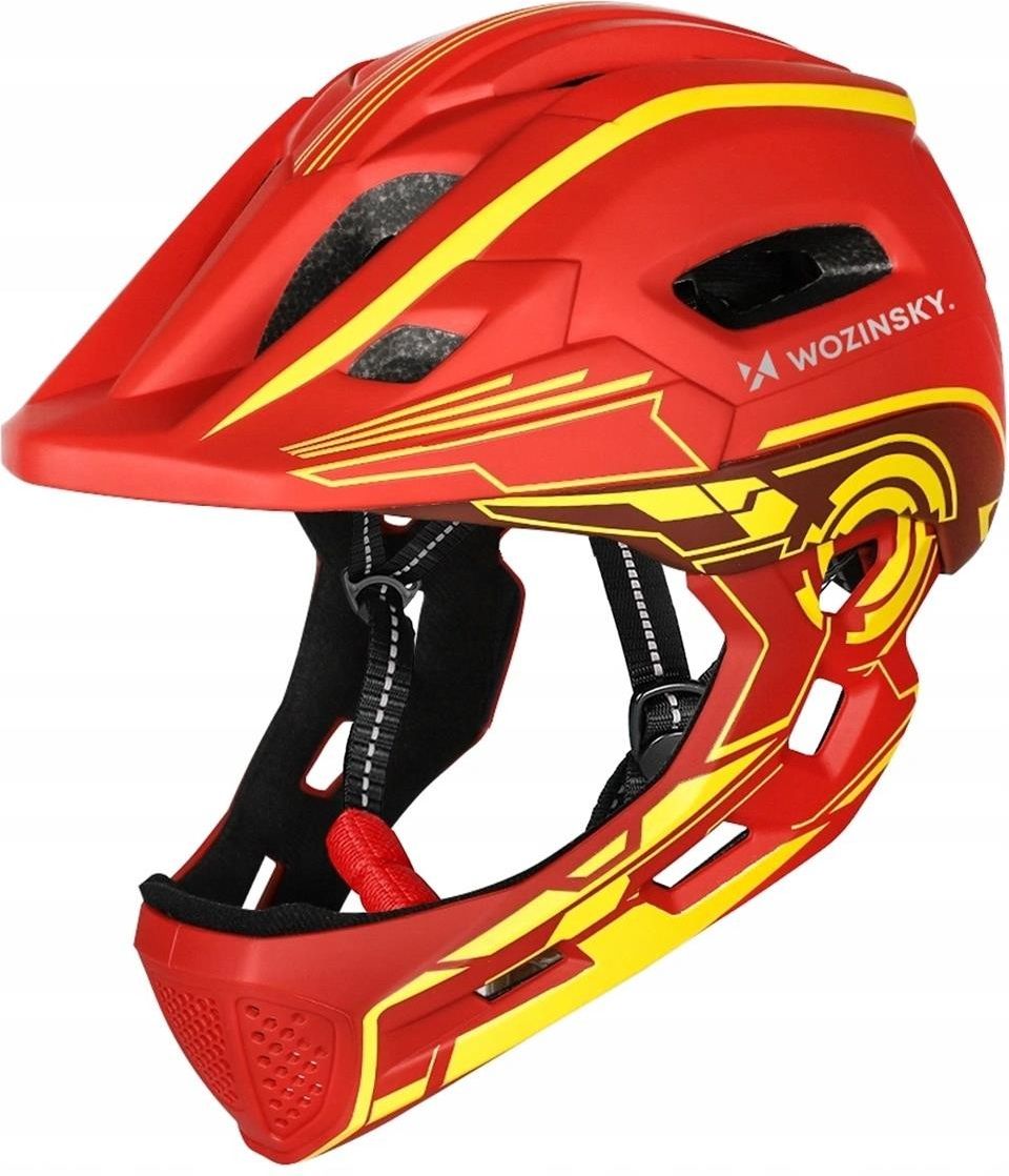 Dziecięcy kask rowerowy Fullface Wozinsky HT-27CZ – ochrona szczęki, lampka LED USB, 52-56 cm, czerwono-żółty Bezpieczeństwo bez kompromisów – pełna ochrona Fullface Kiedy pasja do roweru wkracza na wyższy poziom, standardowa ochrona to za mało. Kask rowerowy fullface Wozinsky HT-27CZ to …