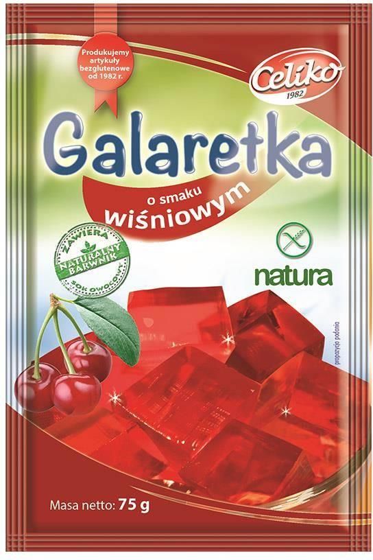 Bezglutenowa galaretka wiśniowa 75g CELIKO Opis produktu Galaretka wiśniowa Celiko to produkt o doskonałym owocowym smaku, produkowany w oparciu o sprawdzone receptury. Galaretka Celiko jest produkowana przy użyciu starannie dobieranych surowców, w oparciu o reżim bezglutenowy. Świetnie sprawdzi się do przygotowywania deserów (np. z dodatkiem owoców), jak również stanowi sprawdzony dodatek do ciast. Produkt posiada certyfikat bezglutenowości. Celiko to polska firma zajmująca się produkcją certyfikowanych produktów bezglutenowych. Sposób przyrządzenia: Zawartość opakowania wyspać do 1/2 l przegotowanej, gorącej wody (nie gotować). Dokładnie wymieszać, aż do rozpuszczenia i studzić. Wlać do naczynia i wstawić do lodówki, aby galaretka stężała. W czasie upałów należy użyć mniej wody. Opakowanie wystarcza na przygotowanie 4 porcji galaretki po ok. 150 g. Przechowywać w suchym i chłodnym miejscu. Składniki: cukier, żelatyna wieprzowa, regulator kwasowości: kwas cytrynowy, sok wiśniowy w proszku 0,5% (maltodekstryna, sok wiśniowy), barwnik: antocyjany, aromat. Produkt może zawierać: mleko, soję i ich produkty pochodne. Opakowanie wystarcza na przygotowanie 4 porcji galaretki po ok. 143 g. Przechowywać w suchym i chłodnym miejscu. Wartość odżywcza w 100 g galaretki w proszku: Wartość energetyczna: 1606 kJ / 378 kcal Tłuszcz: 0 g w tym kwasy tłuszczowe nasycone: 0 g Węglowodany: 83 g w tym cukry: 83 g Białko: 11 g Sól: 0,033 g Waga: 75 g