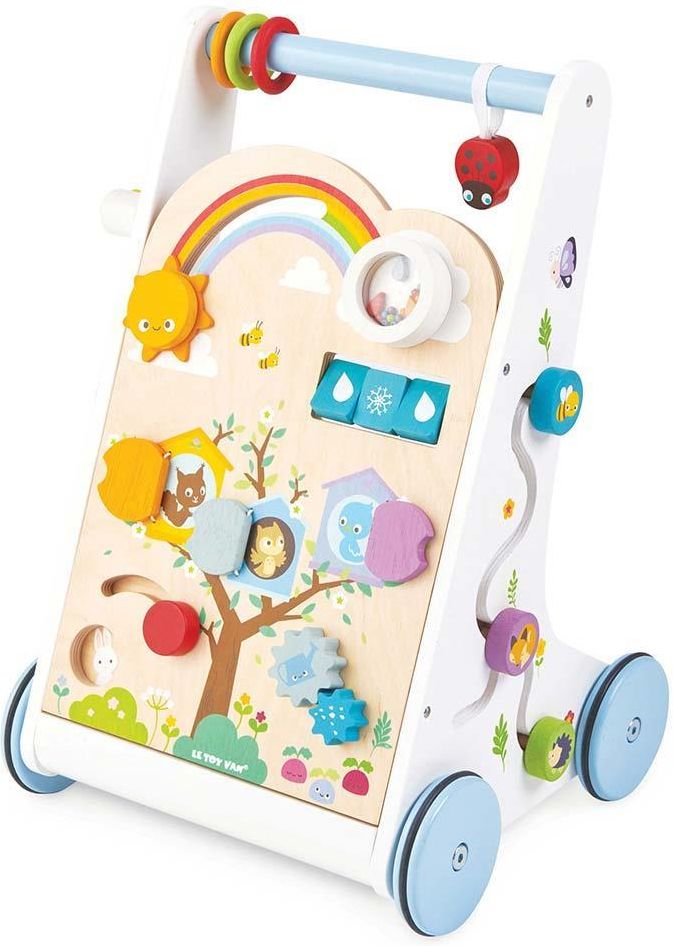 Wielofunkcyjny chodzik z motywami ogrodu, lasu i tęczy oferuje 10 różnych sposobów sensorycznej aktywności i nieskończone możliwości wspaniałej zabawy. Jest to trwała zabawka wykonana z drewna kauczukowego, a ręcznie wykonane elementy są pokolorowane bezpiecznymi dla najmłodszych farbami wodnymi. Chodzik zapewnia Twojemu dziecku doskonałe wsparcie w zachowaniu równowagi i stabilnego chodu podczas nauki i doskonalenia chodzenia, a z każdym małym krokiem dodaje pewności siebie, rozwija koordynację ruchową i zapewnia prawidłowy rozwój sensoryczny Twojego maluszka. Tradycyjny drewniany uroczy chodzik jest gotowy na nowe przygody! Zabawka zachęca małe dzieci do nauki chodzenia, a także do fantastycznej sensorycznej zabawy. Dzięki niemu pierwsze kroki Twojego dziecka będą nie tylko źródłem dumy, ale także wielkiej frajdy! Chodzik został starannie zaprojektowany, dzięki czemu jest trwały i oferuje maluchowi doskonałe wsparcie w zachowaniu równowagi i stabilnego chodu podczas nauki i doskonalenia chodzenia. Twoje dziecko z każdym małym krokiem zyskuje pewność siebie, rozwija koordynację ruchową i motorykę dużą. Zastosowane kolorowe wodne farby są bezpieczne dla nawet najmłodszych dzieci, dzięki czemu masz pewność, że dajesz swojemu maluszkowi wszystko co najlepsze. Zabawka wspiera prawidłowy rozwój sensoryczny, uczy kreatywności i rozwija umiejętności poznawcze. Dzięki intensywnym kolorom chodzik stanowi stylową dekorację każdego pokoju dziecięcego. Ten klasyczny chodzik w zabawny sposób stymuluje umiejętności psychomotoryczne, rozwijanie koordynacji wzrokowo-ruchowej i wyobraźni. Wykonany ze zrównoważonych materiałów, z bezpiecznymi dla dzieci krawędziami stanowi idealny pomysł na przemyślany prezent dla wyjątkowego maluszka, który zaczyna stawiać pierwsze kroki. Elementy do odkrywania i zabawy sprawiają, że pchacz jest niczym centrum sensoryczne, które wspiera ciekawość i zachęca do wczesnej nauki poprzez zabawę. Specyfikacja: Testowane pod kątem bezpieczeństwa dla dzieci powyżej 12 miesiąca życia Wielofunkcyjny drewniany chodzik z 10 różnymi aktywnościami Buduje pewność siebie we wczesnym etapie nauki chodzenia Rozwija zmysły poprzez aktywności sensoryczne Zabawne, jaskrawe kolory i motywy stymulują wyobraźnię Inwestycja w zrównoważoną zabawę - zainspirowaną światem naturalnym i wykonaną drewna o zrównoważonym pochodzeniu Wymiary: Szerokość: 33 x Głębokość: 32 x Wysokość: 51 cm O marce Le Toy Van Misją brytyjskiej marki Le Toy Van jest tworzenie przepełnionych miłością, wyjątkowo pięknych zabawek, które przetrwają próbę czasu i dają naszym pociechom niezrównaną frajdę z zabawy. Zabawki Le Toy Van są wyjątkowe - wytwarzane z drewna i materiałów wyłącznie o zrównoważonym pochodzeniu, wykonane w zgodzie z najsurowszymi standardami europejskimi i amerykańskimi bezpieczeństwa dla dzieci. Marka sprzedaje swoje zabawki na całym świecie, a utalentowany zespół projektantów tworzy je i opracowuje w Wielkiej Brytanii. Firma współpracuje tylko z wykonawcami, którym przyświecają te same ideały i wciąż podnosi poprzeczkę w kwestiach jakości zabawek i standardów ich wykonania. Le Toy Van to marka wielokrotnie nagradzana za jakość, design, bezpieczeństwo, zaangażowanie w środowisko, a także wartość edukacyjną i atrakcyjność zabawy swoich produktów. Zabawki Le Toy Van „występują” w produkcjach wytwórni filmowej Disney, od lat zajmują zasłużone miejsce na szczytach rankingów Vogue, Forbes, GQ, New York Post, The Independent, Glamour i innych. Pomimo tak wielu nagród i wyróżnień Le Toy Van nie spoczywa na laurach i tworzy wciąż coraz lepsze zabawki, które przynoszą radość i magię zabawy dzieciom na całym świecie. Wszystkie zabawki marki Le Toy Van są zbadane w laboratoriach SGS pod kątem zgodności ze standardami ASTM, BS EN-71, EN-71, AUS i CCPSIA.