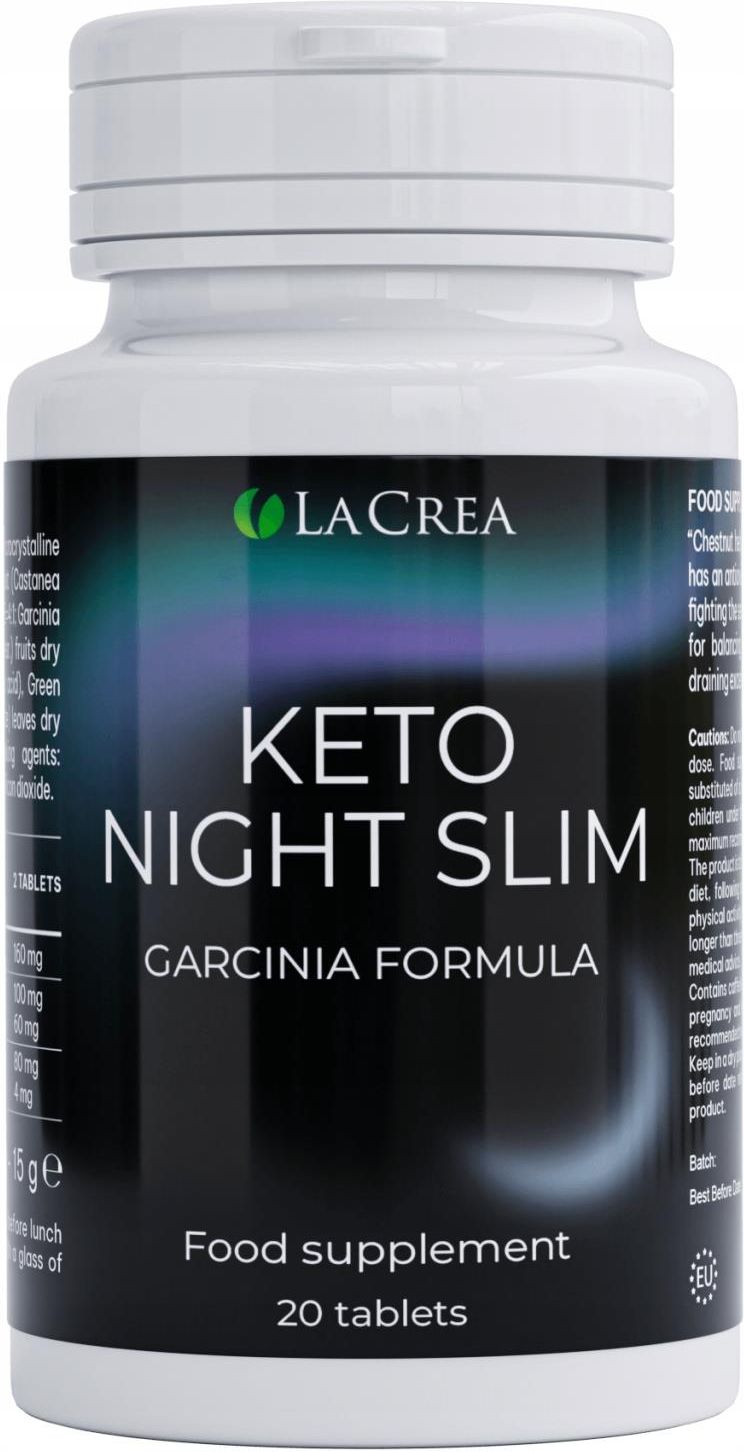 KETO NIGHT to idealne rozwiązanie dla osób, które pragną wspierać proces redukcji wagi nawet podczas snu. Dzięki starannie dobranym składnikom, produkt pomaga zwiększyć metabolizm i wspomaga proces spalania tłuszczu w nocy. Kluczowe funkcje i zalety Nocna redukcja wagi: Składniki aktywne wspierają proces spalania tłuszczu podczas snu. Wzrost metabolizmu: Garcinia cambogia z 60% HCA pomaga zwiększyć metabolizm i wspomaga kontrolę wagi. Detoksykacja organizmu: Ekstrakt z liści kasztanowca wspiera naturalne procesy detoksykacji. Zwiększenie energii: Zielona herbata zawierająca 5% kofeiny wspiera poziom energii, pomagając utrzymać aktywność. Naturalne składniki: Produkt oparty na naturalnych ekstraktach roślinnych, bez sztucznych dodatków. Łatwe dawkowanie: Prosta forma dawkowania - 1 tabletka przed snem. Wysoka jakość: Składniki o wysokiej jakości, gwarantujące skuteczność i bezpieczeństwo stosowania. Wsparcie codziennej aktywności: Produkt wspiera utrzymanie wysokiego poziomu energii i koncentracji. KETO NIGHT to doskonały wybór dla osób pragnących wspierać swoje zdrowie i proces redukcji wagi w naturalny sposób, nawet podczas snu. Maltodextrin, bulking agent: microcrystalline cellulose (cellulose gel) Gymnema (Gymnema sylvestre (Retz) R.br.) leaves d.e. tit. 25% gymnemic acid Moringa (Moringa oleifera Lam.) seeds d.e. tit 40% polysaccharides and 10% glycoside Jujuggiol (Iziphus jujuba Mill.) seeds d.e. tit. 2 % saponins, Whitania (Withania somnifera(L.)Dunal) somnifera roots d.e. tit 2.5% whitanoids Passiflora (Passiflora edulis Sims) grass with flowers d.e. tit 3.5 vitexina Cinnamon (Cinnamomum verum J.Presl) bark d.e. Anti-caking agents: silicon dioxide, magnesium salts of fatty acids 01 Przygotowanie Upewnij się, że masz przy sobie szklankę wody. Wyjmij jedną tabletkę KETO NIGHT z opakowania. 02 Przyjmowanie Weź 1 tabletkę przed snem. Popij ją pełną szklanką wody. 03 Codzienna rutyna Stosuj regularnie, codziennie, aby uzyskać optymalne rezultaty. Pamiętaj, aby nie przekraczać zalecanej dawki. 04 Przechowywanie Przechowuj produkt w suchym i chłodnym miejscu, z dala od bezpośredniego światła słonecznego. Trzymaj z dala od dzieci.