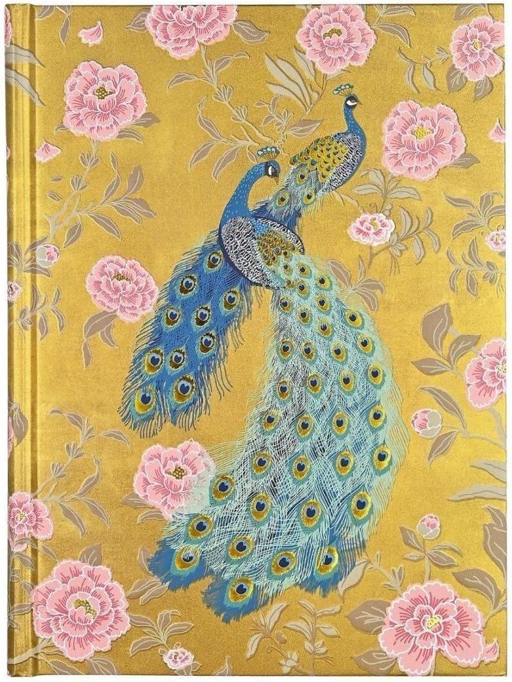 Elegancki notatnik marki Peter Pauper Press Wiktoriański Paw (Victorian Peacock) Okładka z motywem królewskich pawi, umieszczonych na złotym tle. Notatnik posiada okładkę zdobioną złotą folią i tłoczeniami oraz złocone brzegi stron. Szczegóły: okładka sztywna, wytłaczana, ze złotą folią notes jest zszywany złocone brzegi stron wewnątrz dopasowana kolorystycznie wstążka jako zakładka eleganckie wyklejki na początku i na końcu kartki wykonane z wysokiej jakości papieru bezkwasowego - niezwykle trwałe, z cechami gwarantującymi długi czas użytkowania gramatura 120 gsm zadruk w jasnoszare linie, dwustronny, na lekko kremowym papierze wymiary: 15,9 cm x 21,59 cm - format zbliżony do A5 ilość stron: 160