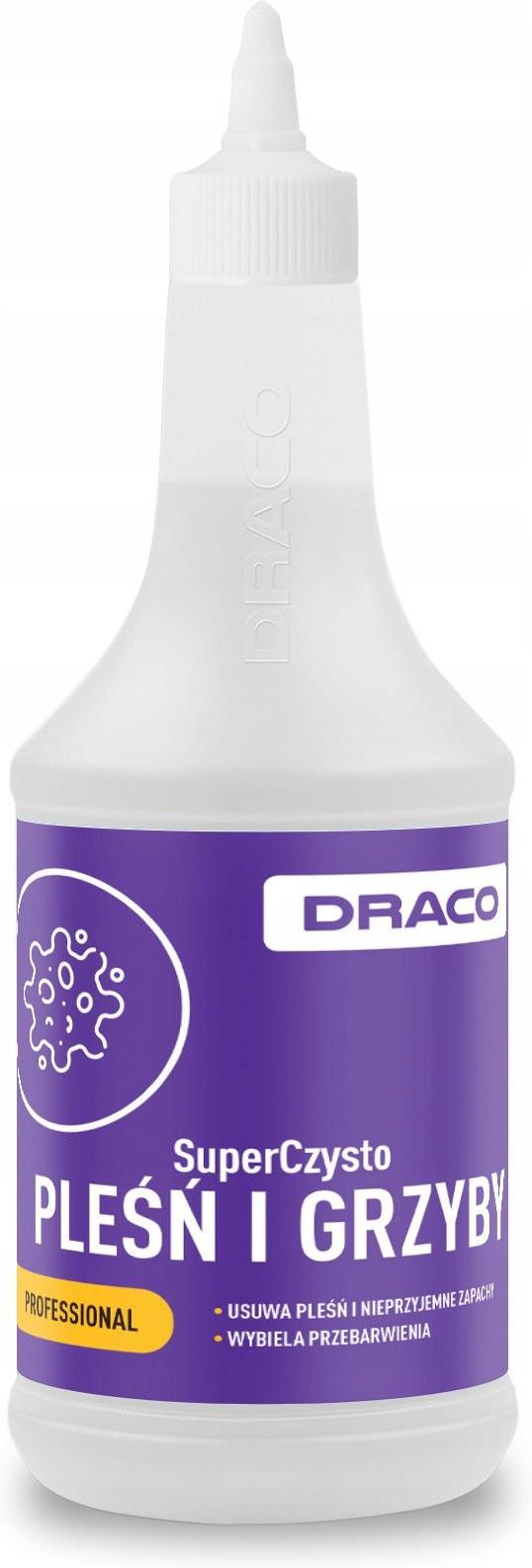 Draco Środek do usuwania pleśni i grzybów 750ml. SuperCzysto PLEŚŃ I GRZYBY 750ml USUWANIE PLEŚNI I GRZYBÓW > Usuwa pleśń i nieprzyjemne zapachy > Wybiela przebarwienia > Ulepszona formuła > Lepsza aplikacja ZASTOSOWANIE Skuteczny i wysoko skoncentrowany produkt o silnym działaniu. Usuwa pleśń, zagrzybienia, nieprzyjemne zapachy, wybiela przebarwienia. Nazwa produktu: SuperCzysto PLEŚŃ I GRZYBY Producent: DRACO Pojemność: 750ml Koncentrat: Nie, gotowy do użycia Przeznaczenie: Skutecznie usuwa pleśń, zagrzybienia i przebarwienia, neutralizuje nieprzyjemne zapachy. Sposób użycia Nanieś produkt bezpośrednio na oczyszczoną powierzchnię. Pozostaw na kilka minut, aby preparat mógł zadziałać. Dokładnie wyczyść powierzchnię szczotką lub gąbką. W przypadku silnych zabrudzeń czynność można powtórzyć. SuperCzysto PLEŚŃ I GRZYBY to skuteczny produkt polskiej firmy DRACO, należący do linii profesjonalnej, opracowany specjalnie do usuwania pleśni i grzybów z różnych powierzchni. Dzięki swojej wysokiej koncentracji i specjalnej formule, jest to niezawodne rozwiązanie dla osób poszukujących skutecznego sposobu walki z niechcianymi mikroorganizmami. Korzyści Skuteczne usuwanie pleśni i grzybów, co przyczynia się do utrzymania czystości i higieny w pomieszczeniach. Eliminacja nieprzyjemnych zapachów, które często towarzyszą problemom z pleśnią i grzybami. Wybielanie przebarwień, przywracając powierzchniom ich pierwotny wygląd i świeżość. Usuwanie pleśni, zagrzybień i przebarwień z powierzchni: Ściany Sufity Podłogi Fugi Uszczelnienia Meble Sprzęt AGD SuperCzysto PLEŚŃ I GRZYBY to niezastąpione rozwiązanie dla profesjonalistów oraz osób dbających o czystość i higienę w swoim otoczeniu. Dzięki temu produktowi walka z pleśnią i grzybami staje się prostsza i bardziej efektywna, pozostawiając powierzchnie czyste, świeże i wolne od niechcianych mikroorganizmów.
