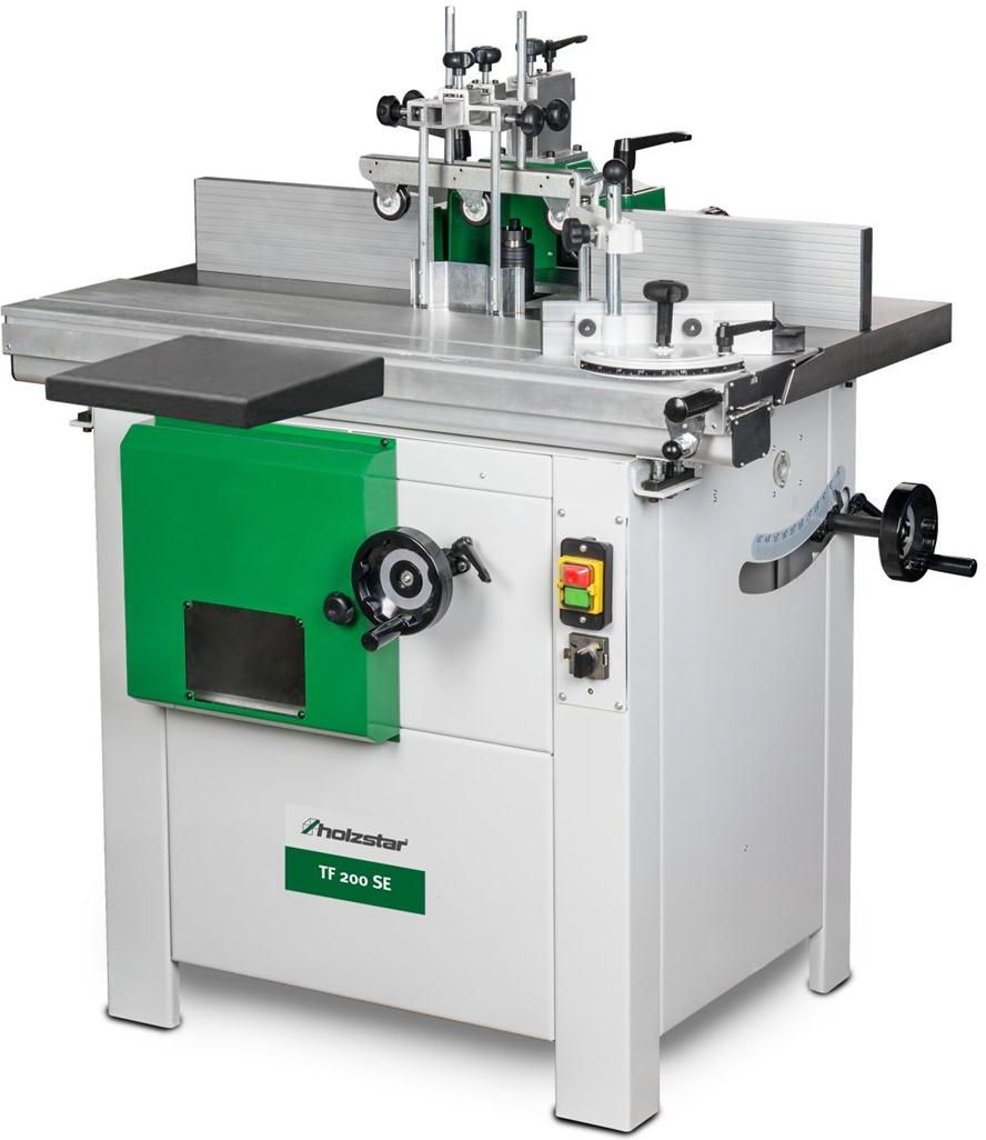 Frezarka o mocy 2,8 kW TF 200 SE Holzstar 5902000 Opis frezarki TF 200 SE firmy Holzstar: Idealna dla rzemieślnika czy ambitnego hobbysty. Stół roboczy wykonany z dobrej jakości żeliwa. Aluminiowy wózek jezdny do czopowania. Wrzeciono przechylne w zakresie +5 do -45 stopni. Osłona frezarki z aluminiowymi prowadnicami elementu. W komplecie docisk mimośrodowy wraz z przykładnicą kątową. W komplecie stolik poszerzający. Liniał poprzeczny regulowany pod kątem. Wrzeciono prawo i lewo obrotowe. Napęd wrzeciona poprzez pasek wielorowkowy. Łatwa zmiana prędkości wrzeciona poprzez drzwiczki rewizyjne z przodu maszyny. Wrzeciono frezu obrotowego do tyłu Ogranicznik frezowania z precyzyjnie regulowanymi ogranicznikami aluminiowymi Szybka i łatwa zmiana prędkości za pomocą wielowypustowych pasków Zakres dostawy TF 200 SE TF 200 SE Dane techniczne frezarki TF 200 SE: Model TF 200 SE Wymiary wózka jezdnego 1000 x 240mm Długość użytkowa wrzeciona 100 mm Przechył wrzeciona od +5° do 45° Max. Ø średnica narzędzia poniżej stołu 180 mm Średnica wrzeciona 30 mm Prędkość obrotowa wrzeciona 1800 / 3000 / 6000 / 9.000 min-1 Moc silnika S6-40% 2,8 kW / 400V Ø króćca odciągowego 100 mm Waga 218 kg Wymiary (dł. x szer. x wys.) 1000 x 850 x 1200 mm
