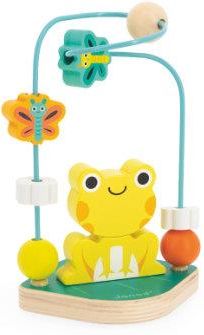 Janod Pętla Edukacyjna Żabka Tropik a Drewniana pętla Żaba z serii Tropik francuskiej marki JANOD to idealna zabawka dla dzieci od 1. roku życia. Na podstawce w kształcie tropikalnego liścia umieszczona jest niebieska metalowa pętla z 7 elementami do przesuwania: 3 koralikami, 2 kwiatkami i 2 motylami. Pod nią, na środku liścia znajduje się mini-piramidka – egzotyczna żółta żaba, złożona z 2 elementów. Przesuwanie klocków po pętli i układanie piramidki rozwija koordynację ruchową i tzw. małą motorykę, a energetyzujące ciepłe kolory (turkus, pomarańcz i żółty) dodatkowo zaciekawiają i zachęcają dziecko do zabawy. Wszystkie elementy są wygodne do trzymania w małych rączkach. Zabawka zaprojektowana została we Francji. Jest zapakowana w estetyczne kartonowe pudełko. Idealnie nadaje się na prezent. a Kolekcja Tropik to seria rozwojowych drewnianych zabawek edukacyjnych dla maluszków od 1. roku życia, utrzymana w elektryzujących tropikalnych barwach. Jej bohaterami są pełne energii zwierzątka z lasów deszczowych, m.in. papuga, wąż, jaguar, lemur, krokodyl czy kameleon. Każda zabawka wspiera potrzeby poznawcze i małą motorykę dziecka. Zabawki edukacyjne marki Janod wyróżniają niebanalne rozwiązania, wysoka jakość materiałów i precyzyjne wykonanie. Podczas beztroskiej zabawy rozwijają zmysły dziecka i wspomagają jego rozwój dzięki mnogości funkcji. Dzięki przypisaniu do odpowiedniej kategorii wiekowej, służą ćwiczeniu adekwatnych na danym etapie umiejętności, jak motoryka dłoni czy kojarzenie kształtów i kolorów. Zabawka rozwija: małą motorykę  rozpoznawanie kształtów i kolorów wiek: 12 miesięcy + liczba elementów: 3 materiał: drewno FSC, metal design: Francja wymiary produktu: 11,5 x 9,2 x 17 cm waga produktu: 0,24 kg wymiary opakowania: 12 x 10 x 18 cm bezpieczeństwo i jakość: EN71-1; EN71-2, EN71-3; REACH a Janod od 1970 roku niezmiennie projektuje zabawki, które są synonimem innowacyjności, francuskiego designu i najwyższej jakości. Unikalne zabawki Janod tworzone są z drewna i innych doskonałych materiałów, a przede wszystkim z dziecięcych marzeń!  W obecnej ofercie Janod jest ponad 500 produktów, z których kluczowe to zabawki drewniane, puzzle, układanki i zabawki magnetyczne. Wszystkie produkty projektowane są we Francji przez własnych designerów. Stąd wiele motywów i wzorów powtarza się w kolekcjach, tworząc wyjątkowy, bajkowy świat Janod.  Wszystkie zabawki tworzone są z dbałością o szczegóły, z najwyższej jakości materiałów, bezpiecznych dla dzieci. Zabawki spełniają restrykcyjne normy bezpieczeństwa, takie jak EN71-1, EN71-2, EN71-3 oraz REACH.