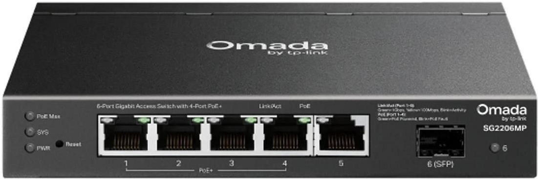 SG2206MP Przełącznik Omada, 6 portów gigabitowych w tym 4 porty PoE+ 5 gigabitowych portów RJ45 w tym 4 porty PoE+ i 1 gigabitowy slot SFP 63W łącznej mocy zasilania, do 30 W dla każdego portu PoE+* Scentralizowane zarządzanie przez chmurę, przez internet lub aplikację Omada† Zarządzanie w trybie …