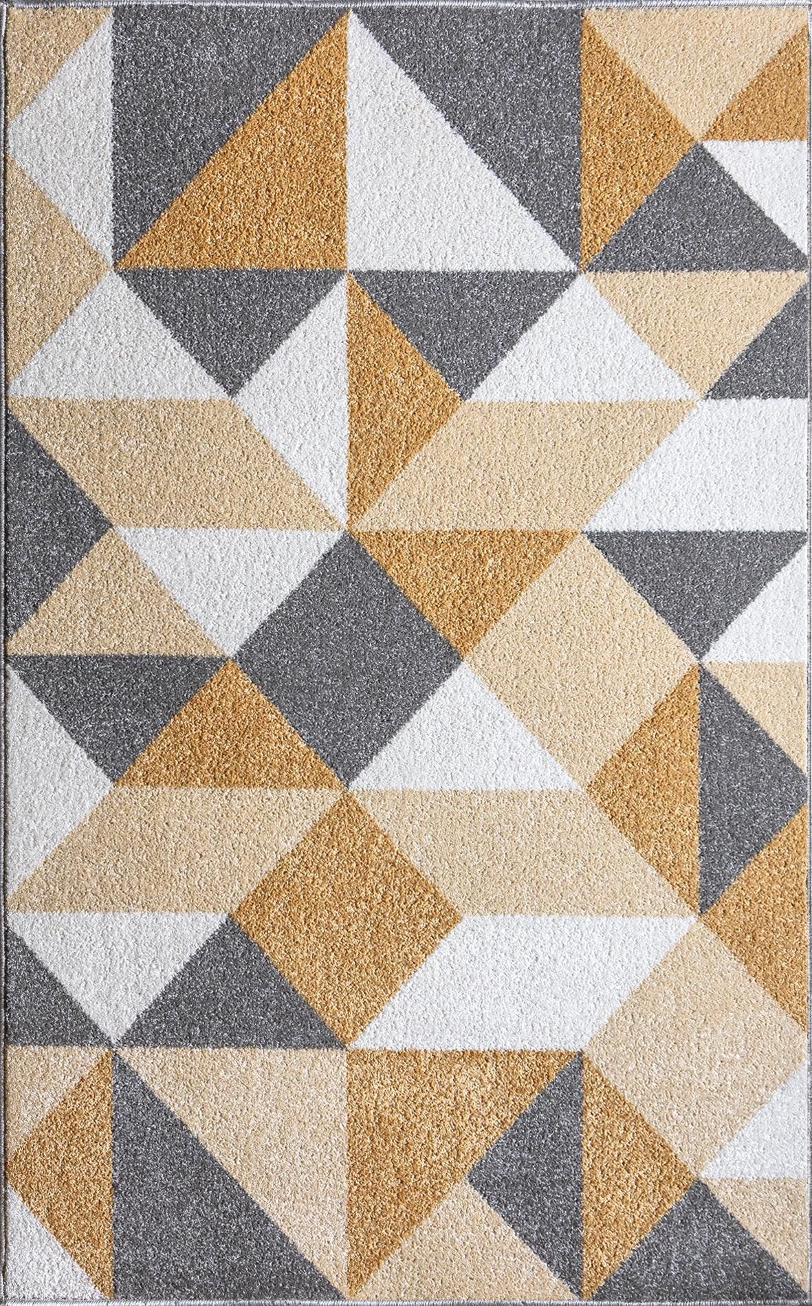 AMIR TRIANGLE to propozycja skierowana do wnętrz nowoczesnych i eklektycznych. Wzór geometryczny w postaci kolorowych trójkątów w odcieniach szarości, bieli i beżu stanowi ciekawą dekorację wnętrza. Model sprawdzi się zarówno w postaci dywanu do pokoju młodzieżowego, jak również nowoczesnego dywanu do salonu. Model dywanu tkanego maszynowo z włókien syntetycznych polipropylenowych heat set frise stanowi gwarancję niezawodnej i wieloletniej jakości. Odcienie dywanu geometrycznego nie ulegają odbarwieniom, a struktura pozostaje sprężysta i miękka, wysoce odporna na odkształcenia oraz ścieranie. Dywan o wymiarach 160 cm szerokości oraz 220 cm długości dostępny jest w sklepie Komfort również w innych wariantach.