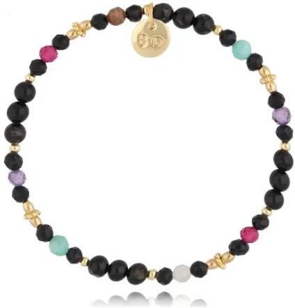 Bransoletka By Dziubeka BTW2745 z kamieniami. Surowiec: stal szlachetna. Kolor surowca: złoty. Kamienie: czarne turmaliny, jadeity. Wielkość kamieni: 0,38 cm – 0,47 cm. Średnica bransoletki: 5,30 cm bez rozciągania gumki.