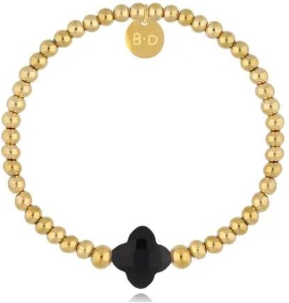 Bransoletka By Dziubeka BSC2037 Surowiec: stal szlachetna Kolor surowca: złoty. Koniczynka: czarny agat. Wielkość koniczynki: 1,23 cm. Wielkość złotych kulek: 0,40 cm. Średnica bransoletki: 5,30 cm bez rozciągania gumki.