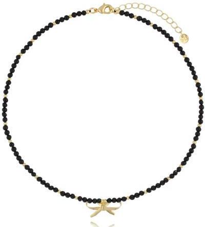 Naszyjnik By Dziubeka NSC0532 z przywieszką w kształcie kokardki. Surowiec: mosiądz. Kolor surowca: złoty. Wielkość elementów: 0,32 cm. Kokardka: 2,14 cm x 1,25 cm. Elementy: czarne agaty. Długość naszyjnika: 38 cm + 5 cm łańcuszek wydłużający. Zapięcie: karabińczyk.