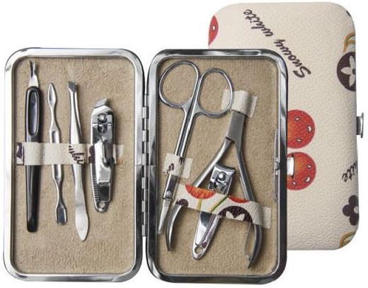 Profesjonalny 7-elementowy zestaw do pielęgnacji paznokci w poręcznym etui zamykanym na zatrzask. Akcesoria wykonane zostały z trwałego i bezpiecznego materiału. Produkty można dezynfekować. Wnętrze etui wyścielone jest odpornym na zarysowania tworzywem. Zestaw zawiera: radełko, kopytko, nożyczki, cążki do skórek, skośna pęseta, dwa obcinacze do paznokci - prosty i skośny. Wymiary etui: 7cm x 12,5cm. *Produkt dostępny w różnych kolorach - wybierany losowo. Prosimy o zamieszczenie informacji o preferowanym wyborze koloru i/lub wzoru w polu "Uwagi" w formularzu zamówienia.