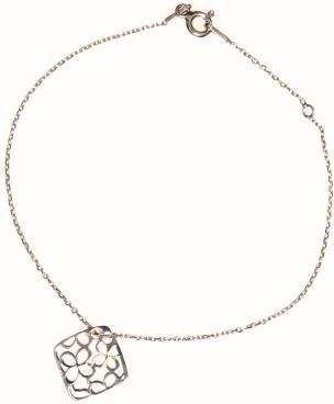 Wyjątkowa oraz delikatna bransoletka typu celebrytka wykonana z wysokiej jakości srebra próby 925. Na utrzymanym w srebrnej kolorystyce łańcuszku zawieszony jest niezwykle modny kwadracik ozdobiony ażurowym wzorkiem. Biżuteria ta stanowi pełen klasy i subtelności prezent na wiele okazji. Długość bransoletki: regulowana od 18cm do 20cm