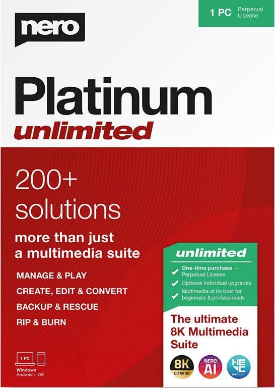 Nero Platinum 2025 Suite - licencja bezterminowa Nowy Nero Platinum 2025 Suite jest dokładnie tym czego potrzebujesz na swoim komputerze z systemem Windows. Program, który umożliwia organizowanie, edytowanie zdjęć, filmów i muzyki, zapewniając wygodę i radość z ich użytkowania. 541 kompleksowych rozwiązań: zaawansowane narzędzia do edycji wideo i zdjęć, tworzenia kopii zapasowych oraz zarządzania plikami – wszystko z nowoczesnym wsparciem sztucznej inteligencji. Najlepszy pakiet multimedialny w historii! Pakiet 7 niezawodnych programów Nero TuneItUp PRO Sprawia, że Twój komputer jest szybszy i poprawia prędkość Internetu. (Program dostępny tylko w wersji 1 PC / 1 rok.) Nero DuplicateManager Photo Oczyszcza archiwum obrazów z dokładnych, zduplikowanych i podobnych obrazów szybko i dokładnie. Nero Video Pozwala na tworzenie, edytowanie i eksportowanie filmów wideo i pokazów slajdów. Nero Media Home Centralne oprogramowanie do archiwizacji, sortowania, tworzenia i odtwarzania Twoich plików. Nero BackItUp Szybkie i łatwe tworzenie kopii zapasowych danych na zewnętrznym dysku twardym, nośniku optycznym lub w chmurze. Nero Recode Konwertuj i zgrywaj filmy i muzykę do wszystkich standardowych formatów dla urządzeń przenośnych. Nero Burning ROM Zgrywanie, kopiowanie, nagrywanie i ochrona danych. Dodatkowe narzędzia wspomagające Twoją pracę Nero AI Photo Tagger: Porządek i struktura w Twoim archiwum zdjęć dzięki sztucznej inteligencji. Nero Score: Zrób test prędkości i wykorzystaj swój komputer do granic możliwości. Nero Motion Tracker: Automatyczne wykrywanie i pikselizacja poruszających się obiektów Nero Screen Recorder: Twórz nagrania ekranu zgodnie ze swoimi pomysłami za pomocą jednego kliknięcia. (Dołączona jest tylko wersja podstawowa) Nero MediaHome: Centralne oprogramowanie do archiwizacji, sortowania, tworzenia i odtwarzania Twoich plików. Nero USBxCopy: To narzędzie pomaga kopiować dane na kilka urządzeń USB w tym samym czasie Nero PhotoSnap: Niech Twoje zdjęcia lśnią nowym blaskiem Nero Soundtrax: Digitalizacja nośników dźwięku i realizacja projektów dźwiękowych Nero WaveEditor: Nagrywanie dźwięku z komputera i nagrywanie plików audio Nero Express: Po prostu wypalaj dane i nośniki Nero CoverDesigner: Dostosuj swoje dyski Nero Face Beautifier Usuń zmarszczki i popraw koloryt swojej skóry, abyś błyszczała w najlepszym świetle Nero Rescue Agent: Odzyskiwanie plików z uszkodzonych dysków i napędów Nero Disc to Device: Przenoszenie nośników z dysków do urządzeń Kompleksowe rozwiązanie multimedialne Koniec z chaosem w Twoim albumie fotograficznym z Nero AI! Teraz organizowanie zdjęć jest jeszcze prostsze – oznaczaj, oceniaj i wyszukuj je z łatwością. Inteligentne rozpoznawanie scen pomaga zachować porządek, umożliwia przypisywanie imion twarzom, a podobne lub zduplikowane obrazy są automatycznie wykrywane i usuwane. Sortuj zdjęcia według lokalizacji, odkrywaj swoje wspomnienia na mapie świata lub przeglądaj je na przejrzystej osi czasu. Edycja jednym kliknięciem? Oczywiście! A to wszystko lokalnie na Twoim komputerze – bez chmury. Zamień swoje najpiękniejsze wspomnienia w małe arcydzieło filmowe – szybko i bez wysiłku! Ożyw swoje wspomnienia dzięki setkom wysokiej jakości szablonów na święta, okazje i wydarzenia! Twórz filmy z efektami picture-in-picture, kanału alfa, tilt shift, slow motion i time-lapse. Edytuj, przycinaj i eksportuj swoje nagrania w najwyższej jakości. Funkcja odtwarzania 8K sprawi, że obraz będzie jeszcze ostrzejszy niż rzeczywistość. Zaimponuj znajomym, prezentując swoje dzieło na dużym ekranie telewizora, lub podaruj je bliskim na płycie optycznej! Muzyka dodaje magii! Odkrywaj swoich ulubionych artystów na nowo i ciesz się dźwiękami jak nigdy dotąd! Zapisuj swoje ulubione utwory z dowolnego serwisu muzycznego – łatwo, szybko, legalnie i w najlepszej jakości! Edytuj i przycinaj pliki dźwiękowe według własnych potrzeb, dodając efekty, fade-in/out czy regulując głośność. Importuj kolekcję płyt CD i swobodnie edytuj metadane, takie jak wykonawca, gatunek czy okładka albumu. Bezpieczne i wygodne tworzenie kopii zapasowych Twórz kopie zapasowe swoich cennych danych szybko i bez wysiłku! Zapisuj je na zewnętrznych dyskach, nośnikach optycznych, a teraz także w chmurze (Google Drive, OneDrive, MagentaCLOUD, HiDrive, pCloud, QLOUD). Korzystaj z automatycznych kopii zapasowych, migawek przyrostowych i zarządzania wersjami. Chroń swoje dane 256-bitowym szyfrowaniem na płytach CD, DVD i pamięciach USB. Przydatne narzędzia Nero Platinum to kompleksowy zestaw narzędzi dla Twojego komputera z systemem Windows! Odzyskuj skasowane dane, szyfruj pliki z łatwością i niezawodnie formatuj oraz duplikuj nośniki. Dzięki Nero Platinum masz wszystko, czego potrzebujesz, aby być przygotowanym na każdą ewentualność. PC-Tuning Nie ma nic bardziej frustrującego niż wolny komputer! Dzięki Nero zoptymalizujesz system jak profesjonalista – przyspiesz działanie, aktualizuj sterowniki i zwiększ prędkość Internetu. Masz pełną kontrolę nad wydajnością swojego PC – zdecyduj, czy chcesz rozwiązywać problemy pojedynczo, czy wszystkie naraz!