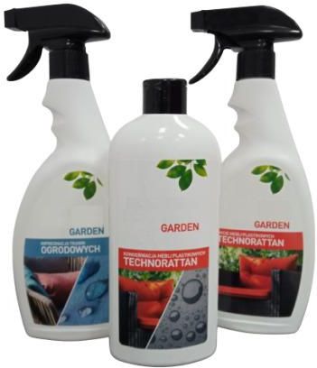 Zestaw środków do czyszczenia i impregnacji mebli ogrodowych oraz tkanin. W skład zestawu wchodzi: Preparat do konserwacji mebli technorattanowych Środek do czyszczenia mebli technorattanowych Impregnat do tkanin ogrodowych Preparat do konserwacji mebli technorattanowych: Mleczko do renowacji i konserwacji mebli ogrodowych wykonanych z tworzyw sztucznych oraz technorattanu. Dzięki nowoczesnej formule opartej na woskach oraz nanotechnologii SiO², środek wnika w powierzchnie, regeneruje i pogłębia ich kolor. Preparat tworzy trwałą hydrofobową powłokę, która ogranicza przywieranie brudu, co ułatwia utrzymanie mebli w czystości. Środek do czyszczenia mebli technoratanowych: Specjalistyczny środek do mycia mebli ogrodowych wykonanych z tworzyw sztucznych oraz technorattanu. Dzięki nowatorskiej formule skutecznie czyści, nie uszkadzając przy tym mytej powierzchni Impregnat do tkanin ogrodowych: Impregnat do zabezpieczania wszelkiego rodzaju tekstyliów ogrodowych takich jak: poduszki, pledy, parasole, namioty, pawilony, plandeki, pokrowce na meble i grille. Unikalna formuła nanotechnologii daje efekt hydrofobizacji. Zaimpregnowany materiał odpycha cząsteczki wody i brudu nie pozwalając im wniknąć we włókna materiału, co zabezpiecza tkaniny przed zawilgoceniem oraz zabrudzeniem. Preparat nadaje się do wszystkich materiałów włókienniczych, zarówno naturalnych jaki i sztucznych.