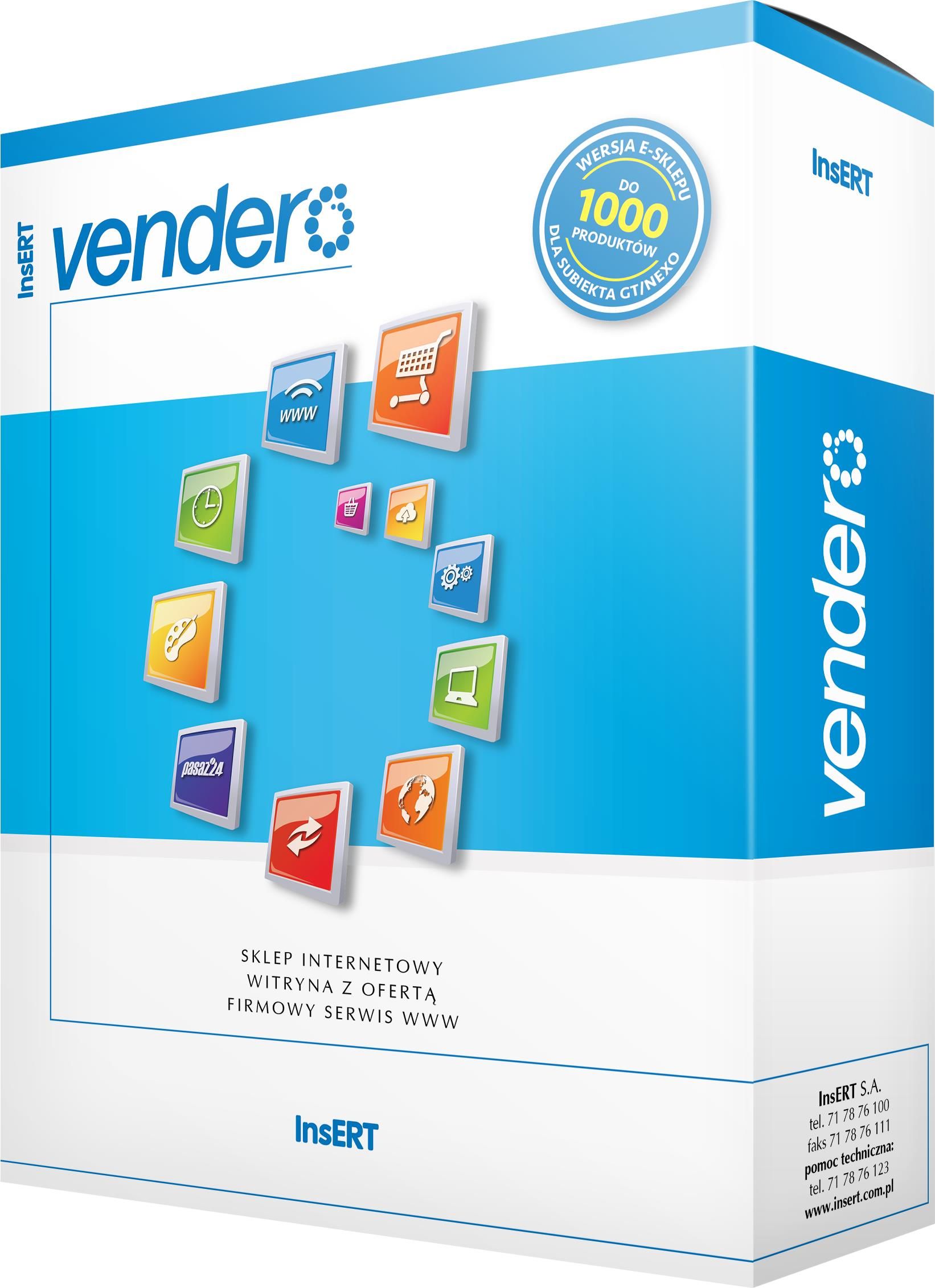 W zamówieniu proszę podać nr licencji i nip w formie tekstu Subiekta w którym mamy aktywować Vendero vendero ( licencja na 1 rok wersja elektroniczna - dla posiadaczy abonamentu na aktualizację Subiekta gt / nexo) to prosty i wygodny sposób na zaistnienie z biznesem w Internecie. Aplikacja umożliwia posiadaczom systemu InsERT GT lub InsERT nexo założenie sklepu internetowego, witryny z ofertą lub firmowego serwisu - szybko i łatwo, bez specjalistycznej wiedzy na temat tworzenia stron WWW. Intuicyjny kreator poprowadzi użytkownika krok po kroku do gotowej witryny w ciągu zaledwie kilku minut. Wystarczy wybrać jeden z wielu szablonów graficznych, liczbę podstron i elementy, które mają się na nich znaleźć. Stworzonym w ten sposób serwisem można zarządzać z dowolnego miejsca z dostępem do Internetu.Dzięki vendero można stworzyć jeden z trzech typów serwisów: sklep internetowy - umożliwia wygodną sprzedaż towarów z Subiekta GT lub Subiekta nexo. Zamówienia ze sklepu trafiają bezpośrednio do Subiekta, a panel administracyjny zapewnia pełną kontrolę nad zawartością, wyglądem oraz funkcjonalnością serwisu witryna z ofertą - strona prezentująca szczegółową ofertę produktów i usług (z podziałem na kategorie). Dane o towarach są importowane z Subiekta GT lub Subiekta nexo do witryny (m.in. nazwa, cena, zdjęcia towaru). Można tam zamieścić również informacje o firmie, aktualności i dane kontaktowe firmowy serwis WWW - serwis, w którym można zamieszczać najważniejsze informacje o firmie, ogólny opis oferty (bez prezentowania produktów), aktualności, dane kontaktowe itp. Najważniejsze zalety vendero: łatwy i szybki start – własny sklep lub witrynę można założyć za pomocą kilku kliknięć – wszystkie dane są pobierane z uzupełnionych pól w systemie InsERT GT lub InsERT nexo, a prosty kreator prowadzi krok po kroku przez cały proces zakładania witryny prosta modyfikacja wyglądu witryny – gotowe szablony graficzne oraz widgety pozwalają dostosować witrynę do indywidualnych preferencji zawartość, układ i kolorystykę serwisu można w dowolnym momencie modyfikować kompletny pakiet – nie ma potrzeby wykupywania domeny i serwera – pakiet obejmuje hosting oraz prosty i czytelny adres internetowy stały dostęp – serwisem stworzonym w vendero można zarządzać z dowolnego miejsca wystarczy urządzenie z dostępem do Internetu i przeglądarka stron WWW. integracja z Subiektem GT lub Subiektem nexo – wszystkie wybrane towary i usługi z Subiekta automatycznie pojawiają się w sklepie, a każde złożone zamówienie trafia do Subiekta, co zapewnia pełną kontrolę nad pracą całego systemu przejrzysta informacja – dokładne zestawienie zamówień pozwala w każdym momencie sprawdzić, na jakim etapie realizacji znajduje się dany zakup - i to zarówno po stronie klienta, jak i administratora sklepu komunikacja z klientami – mechanizm powiadomień pomaga utrzymać bezpośredni kontakt z klientami i na bieżąco informować ich o nowych ofertach integracja z płatnościami internetowymi PayU – vendero umożliwia wybór wielu rodzajów płatności, w tym szybkich płatności PayU. Wymagania systemowe vendero: dla sklepu internetowego oraz witryny z ofertą – licencja do Subiekta GT (wersja 1.38 lub wyższa) lub Subiekta nexo (wersja 6.0.0 lub wyższa) dla firmowego serwisu WWW – licencja do dowolnego programu z linii InsERT GT (1.38 lub wyższa) lub InsERT nexo (6.0.0 lub wyższa) stały dostęp do Internetu w celu zarządzania sklepem i zbierania zamówień przeglądarka internetowa – np. Microsoft Internet Explorer w wersji 9.0 (lub nowszej) korzystanie z vendero może wymagać aktualizacji współpracujących z nim systemów sprzedaży Subiekt GT/nexo (bezpłatnie). Wymagania systemowe InsERT GT: komputer z procesorem minimum 1,0 GHz (zalecane 2,0 GHz lub lepszy) minimum 4 MB pamięci RAM (zalecane 8 GB lub więcej) system operacyjny Microsoft Windows Server 2003, Windows XP SP3, Windows Vista, Windows 7, Windows 8 (lub nowszy) system obsługi baz danych Microsoft SQL Server 2000, 2005, 2008, 2012 lub 2014 - bezpłatna wersja Microsoft SQL Server 2008 R2 Express Edition dostarczana jest na instalacyjnej płycie DVD. Wymagania systemowe InsERT nexo: komputer z procesorem Core2Duo lub nowszym 4GB pamięci operacyjnej RAM system operacyjny Windows 8.1 lub nowszy (zalecany Windows 10) system obsługi baz danych Microsoft SQL Server 2008 R2 SP2 lub wersja nowsza. Dostępne jako moduł (vendero) w programie z linii InsERT GT (od wersji 1.38) lub InsERT nexo (od wersji 6.0.0). WAŻNE - cena tylko dla posiadaczy aktywnego abonamentu na Subiekt GT / nexo