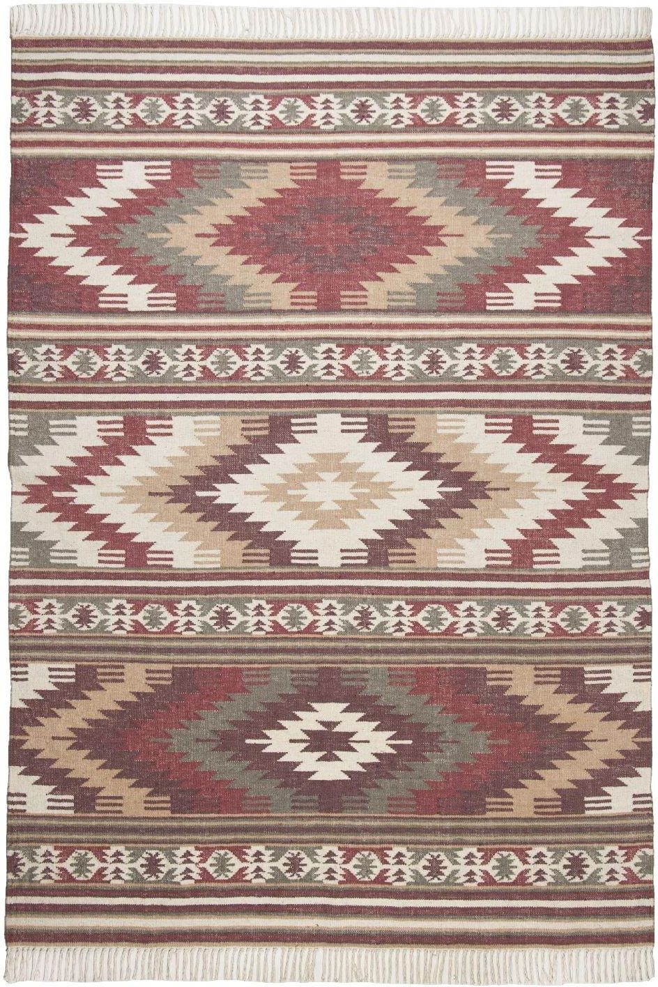 DYWAN VINTAGE KELIM C I RED 140X200 to wyjątkowo przytulny i utrzymany w ciepłej palecie barw dywan z frędzlami oraz motywem charakterystycznych rombów wpisujących się w estetykę boho. Dywan bordowy o wymiarach 140 cm szerokości, 200 cm długości oraz 5 mm grubości wykonany został z naturalnych włókien metodą tkania ręcznie. Dywany wełniane z dodatkiem bawełny są trwałe, odporne na ścieranie i wgniecenia, wykazują właściwości termoizolacyjne oraz antyelektrostatyczne. Dzięki temu sprawdzą się w otoczeniu alergików.