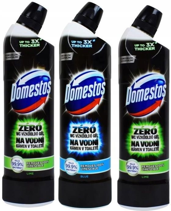 {desc/50/} {desc/50/} PŁYNY DO CZYSZCZENIA TOALET DOMESTOS ZERO KAMIENIA PINK + LIME + BLUE ✅Domestos Zero Kamienia gwarantuje czystość absolutną i zapewnia maksymalną skuteczność w Twojej toalecie. ✅To bezkonkurencyjny niszczyciel kamienia docierający nawet do najtrudniej dostępnych zakamarków. {desc/50/} Specyfikacja: ✅Zabija zarazki; ✅Niszczy najmocniej osadzony kamień i zapobiega powstawaniu; nowego ✅Usuwa bakterie, grzyby i spory (także z trudnodostępnych miejsc); ✅Konsystencja gęstego płynu szczelnie pokrywa wszystkie miejsca i tworzy powłokę zabezpieczającą; ✅Działa nawet poniżej linii wody; ✅Dzięki wygodnej butelce sprzątanie trwa kilka chwil, a produkt dociera nawet do najbardziej niedostępnych miejsc; ✅Pojemność - 3x 750 ml ✅Waga z opakowaniem - 3x 0,86 kg ✅Postać - żel {desc/50/} {desc/50/} {desc/50/} 3x GĘSTSZY OD INNYCH PŁYNÓW! ✅Gęsta konsystencja dokładnie przylega do ścianek muszli, a wygodna butelka z zagiętą szyjką pomogą dostać się do wszelkich zakamarków i zagłębień w toalecie – jednocześnie ograniczając Twój kontakt z klozetową otchłanią do minimum.