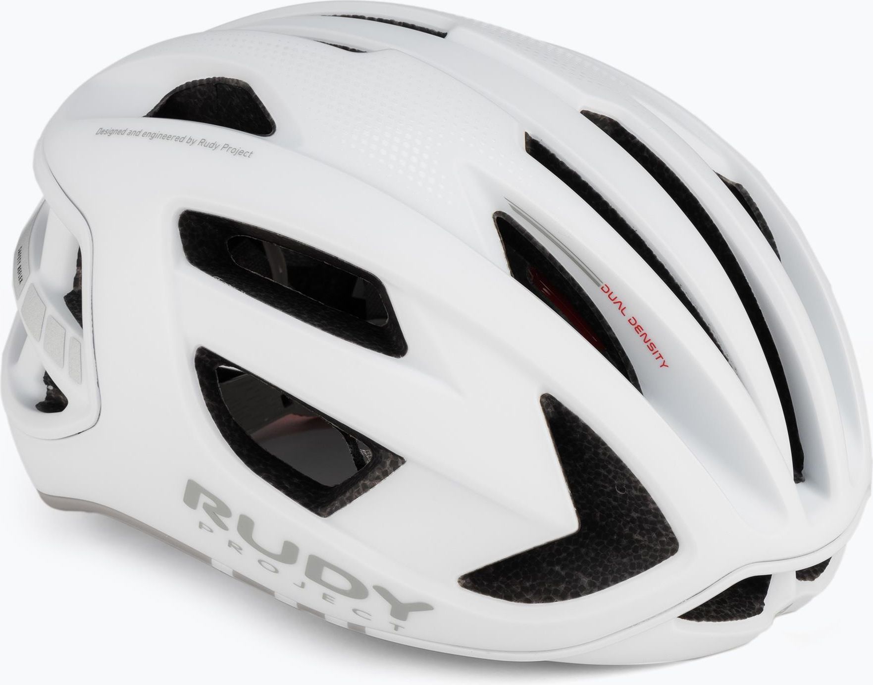 Rudy Project Egos to kask rowerowy od uznanej amerykańskiej marki. Zaprojektowano go nie tylko w celu ochrony głowy przed urazem, ale także, aby oferować jak największy komfort podczas jazdy. Tak by kask nigdy nie ciążył, a stał się naturalnym przedłużeniem ciała w trakcie pokonywania kolejnych kilometrów na szlaku. W tym celu opracowano i wdrożono kilka nowości konstrukcyjnych i technologii: DUAL DENSITY to nowe wypełnienie kasku o podwójnej warstwie. Jego specjalnie zaprojektowany i przetestowany kształt oferuje większą wentylację czubka głowy. Ten często niesłusznie niedoceniany element zapewnia o wiele większy komfort termiczny podczas wymagającej aktywności fizycznej. Dodatkowo wypełnienie ma miękką strukturę, która amortyzuje drgania przenoszone ze skorupy, chroniąc przed dyskomfortem na nierównej nawierzchni. AirFrame Band to najnowsza generacja cenionej przez rowerzystów wyściółki. Pozwala ona aktywnie transportować powietrze wprowadzane pod kask przez 23 otwory wentylacyjne i rozprowadzać je po całej skórze głowy. Następnie jest ono odprowadzane wraz z nadmiarem ciepła oraz wilgoci przez specjalny perforowany panel z tyłu konstrukcji. Sprawia to, że o wiele dłużej zachowasz świeżość podczas jazdy, a skóra głowy będzie mniej się pocić. Ergo Divider to specjalistyczny rozdzielacz pasów na wysokości szczęki. Redukuje on wrażenie ucisku, bez powodowania niebezpiecznych luzów w mocowaniu kasku. W efekcie zwiększa się Twój komfort jazdy, a paski idealnie układają się względem ciała. FIDLOCK to system mocowania zastępujący klasyczny zatrzask. Wykorzystuje on specjalną klamrę magnetyczną, którą można wygodnie obsługiwać nawet jedną dłonią. Dodatkowo możesz zapomnieć o nieprzyjemnościach związanych z zakleszczeniem skóry w klasycznych zatrzaskach – FIDLOCK jest całkowicie bezpieczny i intuicyjny w obsłudze. System RSR11, który umożliwia mikrometryczną regulację zarówno wysokości, jak i szerokości wewnętrznego koszyka kasku. W efekcie zawsze idealnie dopasujesz ramę do kształtu swojej głowy. Ten szybki i przyjazny użytkownikowi system obsługuje się przy pomocy wygodnie umieszczonego pokrętła. Kask rowerowy Rudy Project Egos spełnia wszystkie rygorystyczne wymogi bezpieczeństwa narzucane przez zewnętrzne instytucje. Przeszedł także autorski test uderzenia obrotowego amerykańskiej marki – RP Rotation Impact Test, wskazujący na wysoki standard ochrony głowy przed ewentualnym uderzeniem przy upadku.